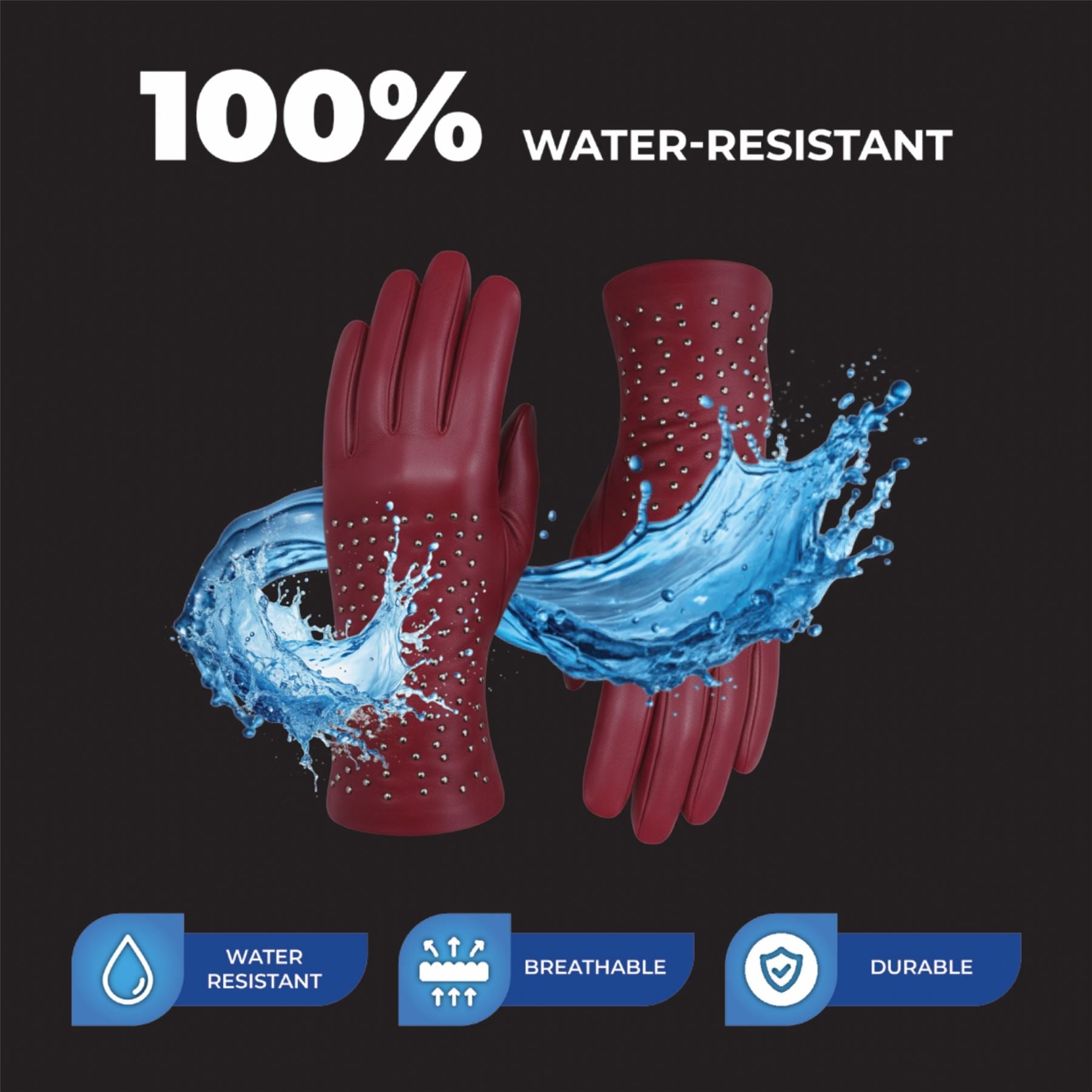 Make a bold fashion statement with Infinity Leather’s women’s studded gloves, crafted from luxurious Italian leather. These water-resistant gloves feature elegant metal stud detailing, touchscreen compatibility, and a soft wool lining—combining edgy style, warmth, and practicality for modern sophistication.