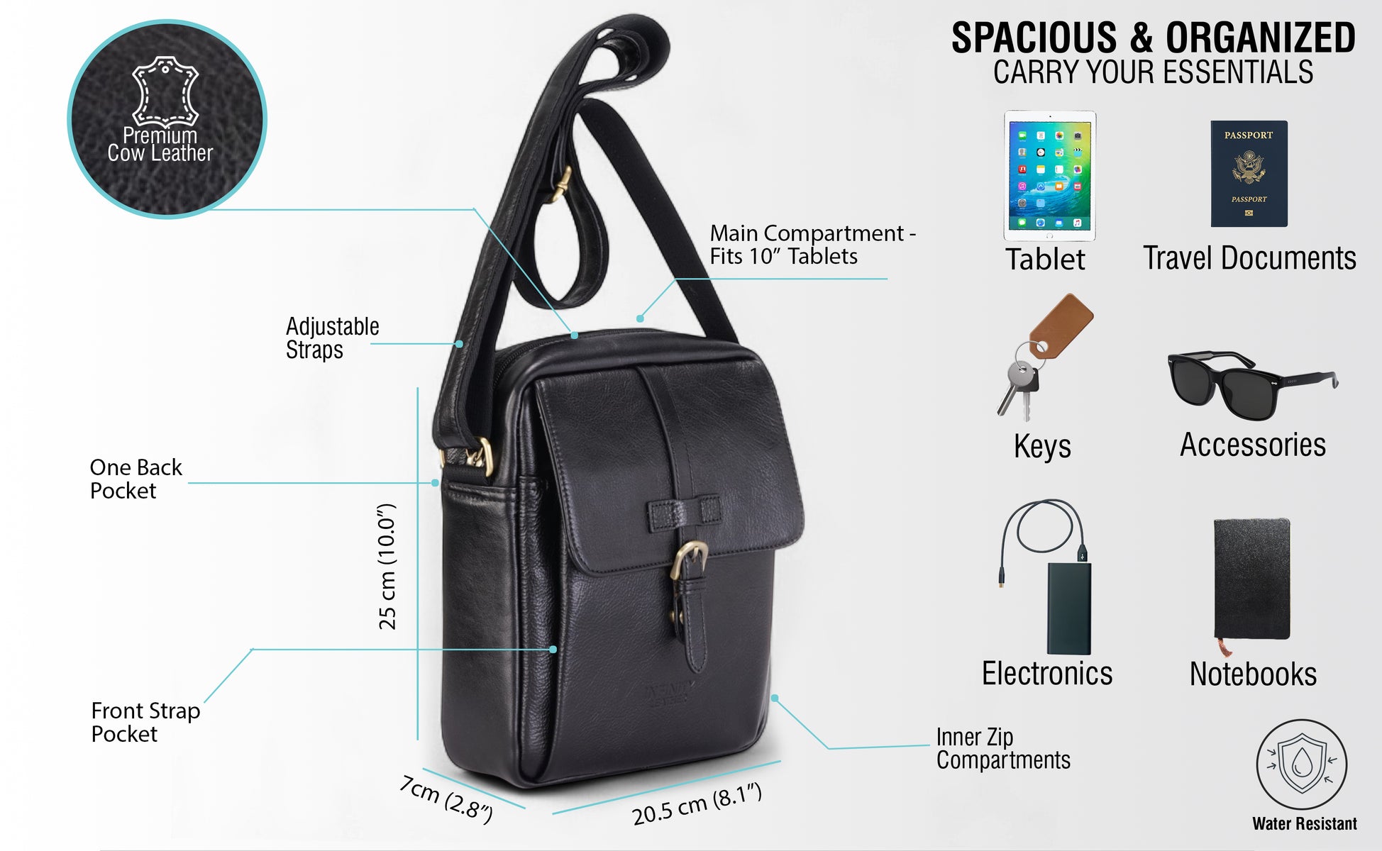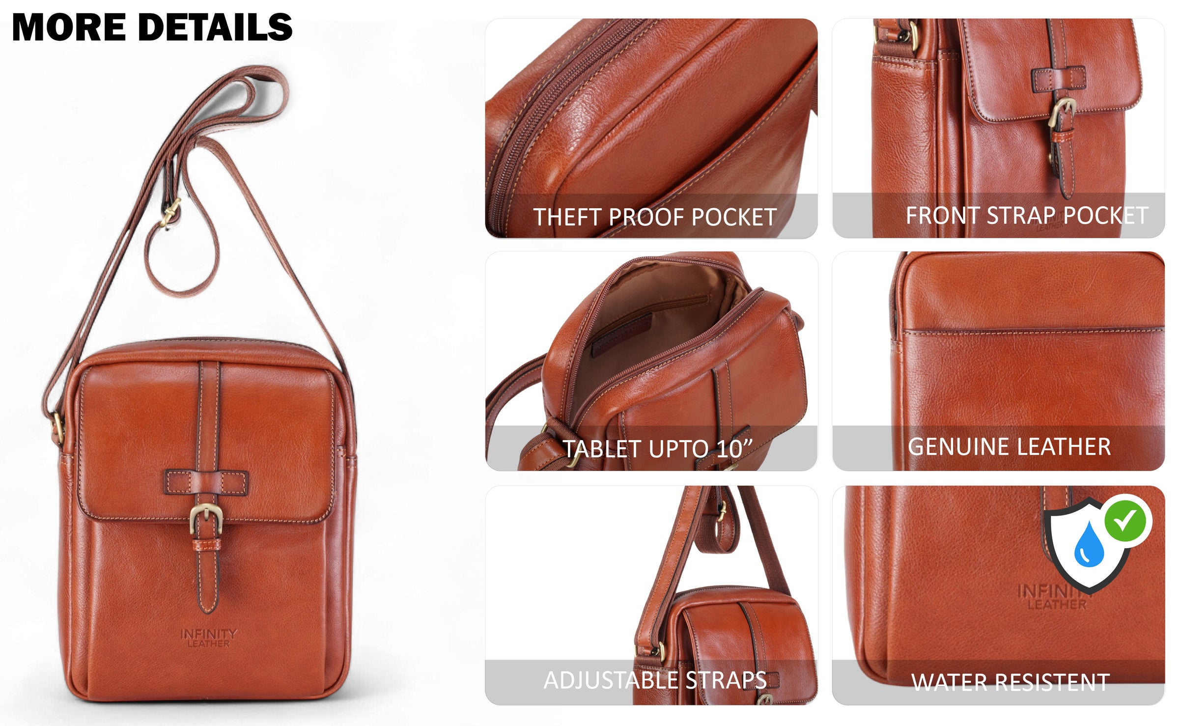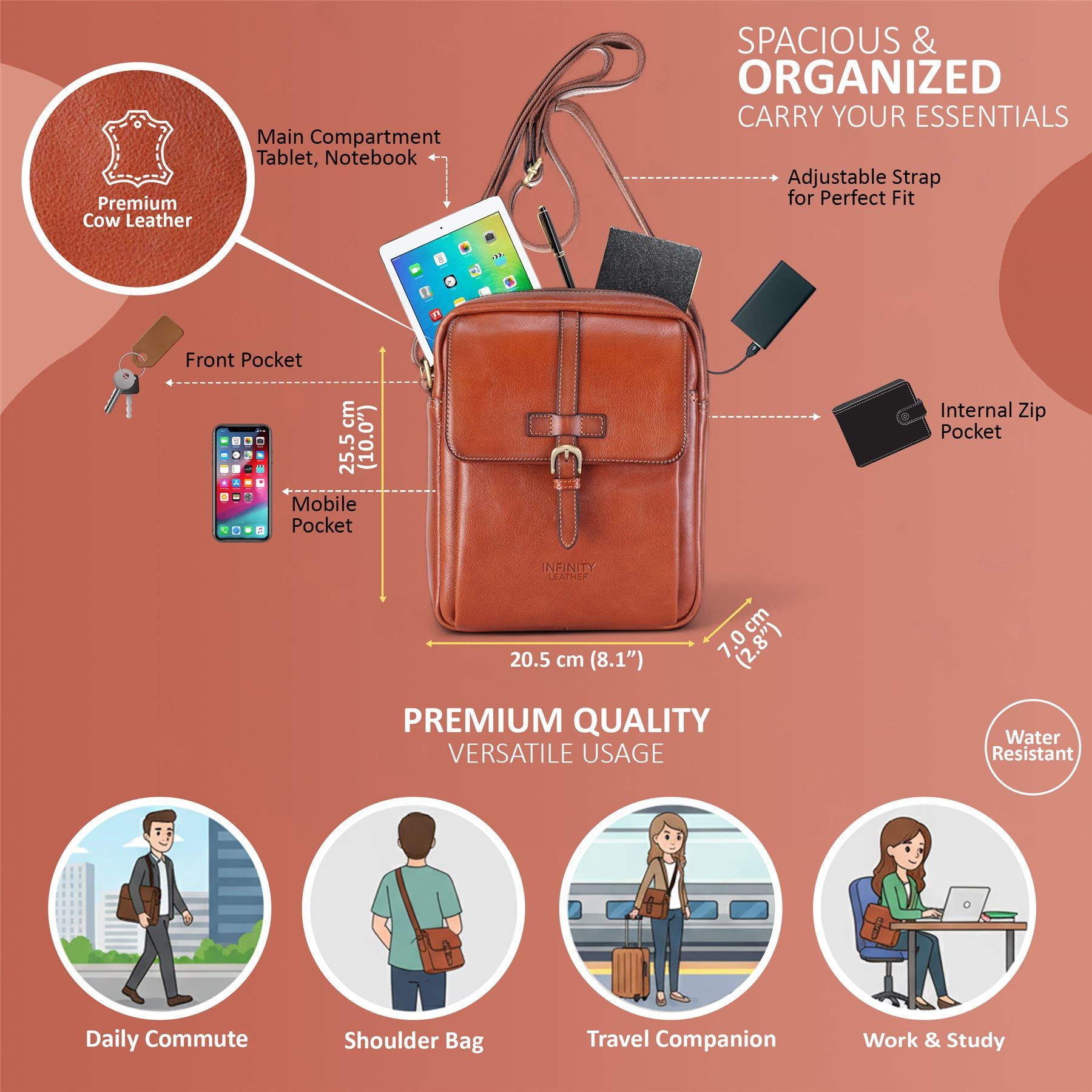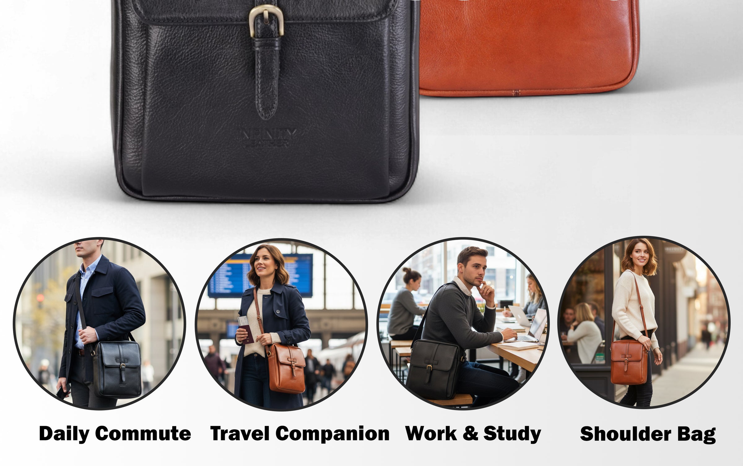 This Vintage Genuine Leather Messenger Bag combines timeless style with practical functionality. Handcrafted from luxury cowhide leather, it develops a rich patina over time. Compact yet spacious, it fits tablets up to 10 inches and daily essentials. Multiple pockets, thick nylon lining, antique brass hardware, and an adjustable shoulder strap make it perfect for commuting, travel, or work.