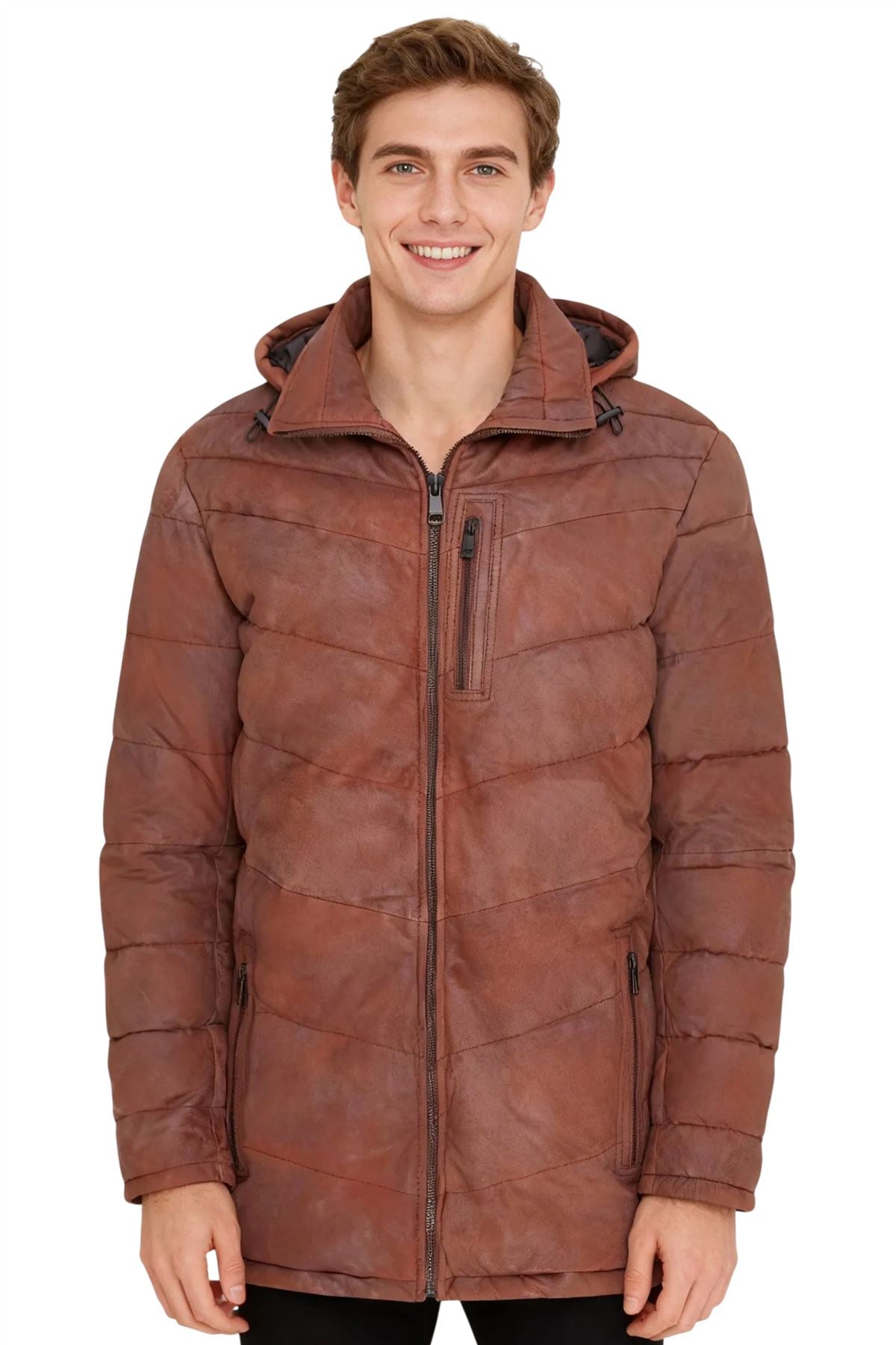 Defy the cold in style with this luxurious men's Puffer Coat crafted from soft lamb leather in a rich color. The warm, padded design features a modern chevron quilt pattern and a practical removable hood for ultimate protection. With six pockets, it perfectly blends warmth, style, and utility for winter wear.