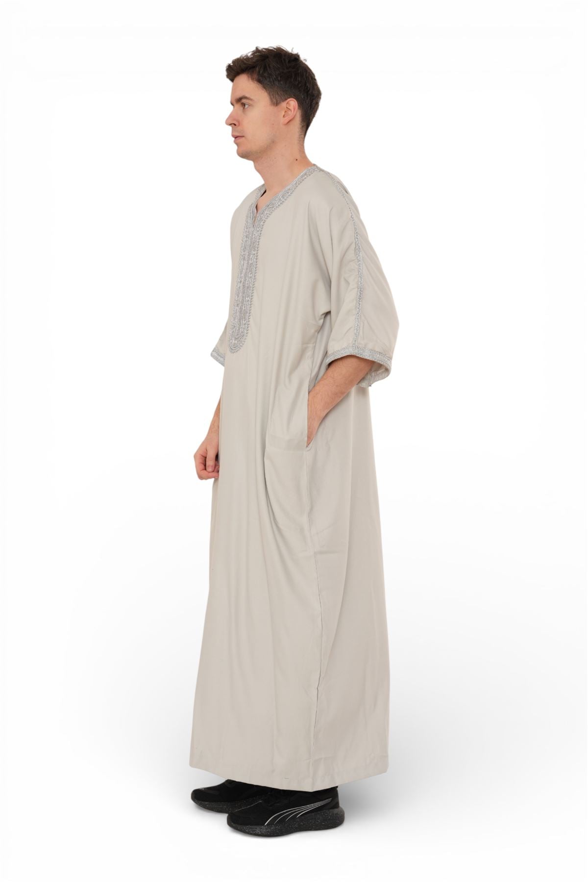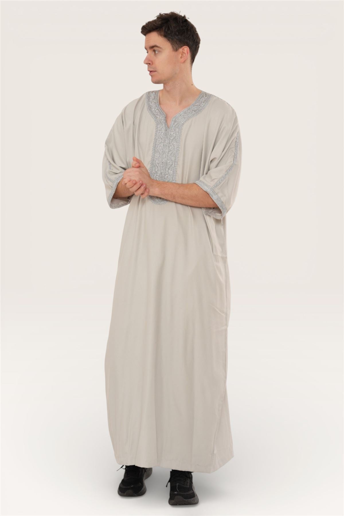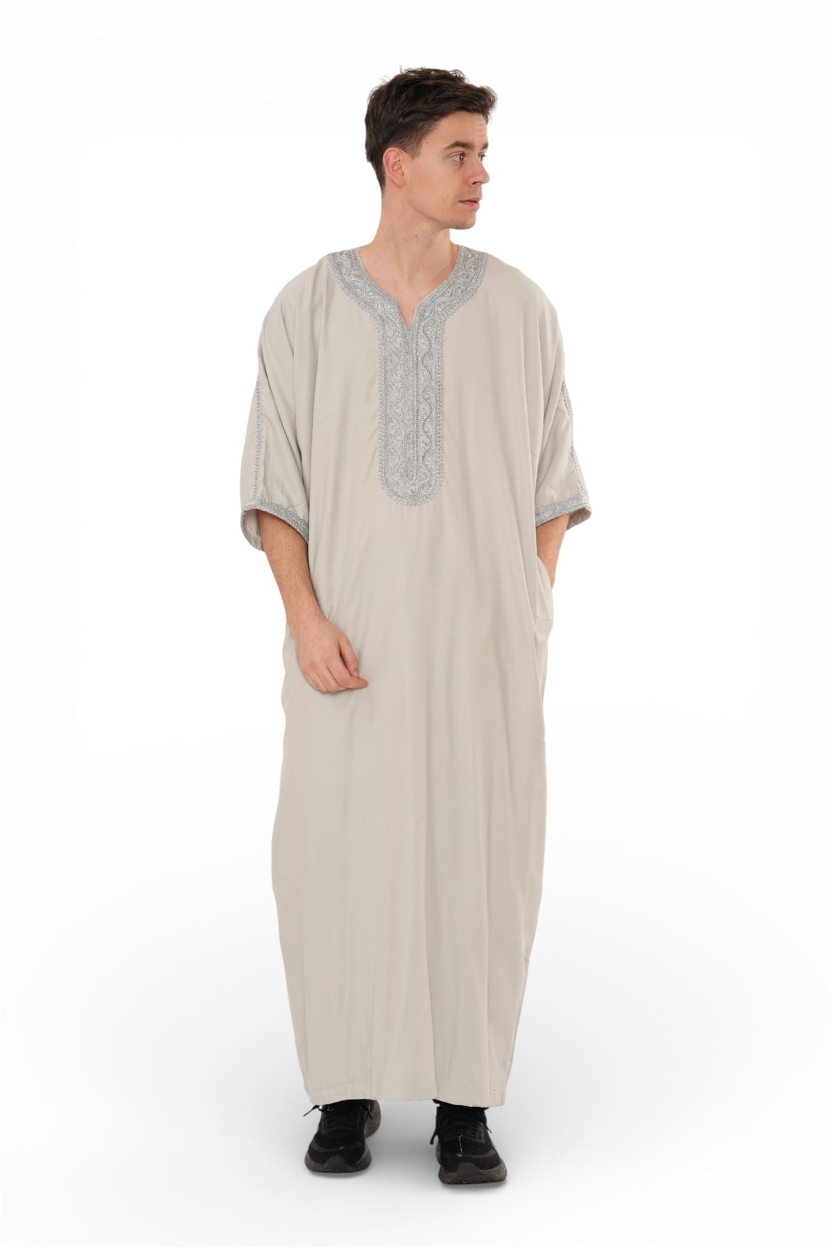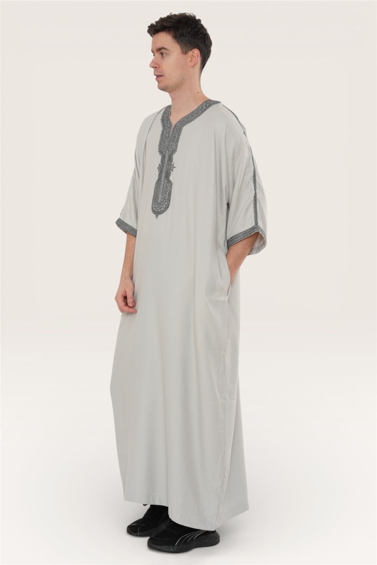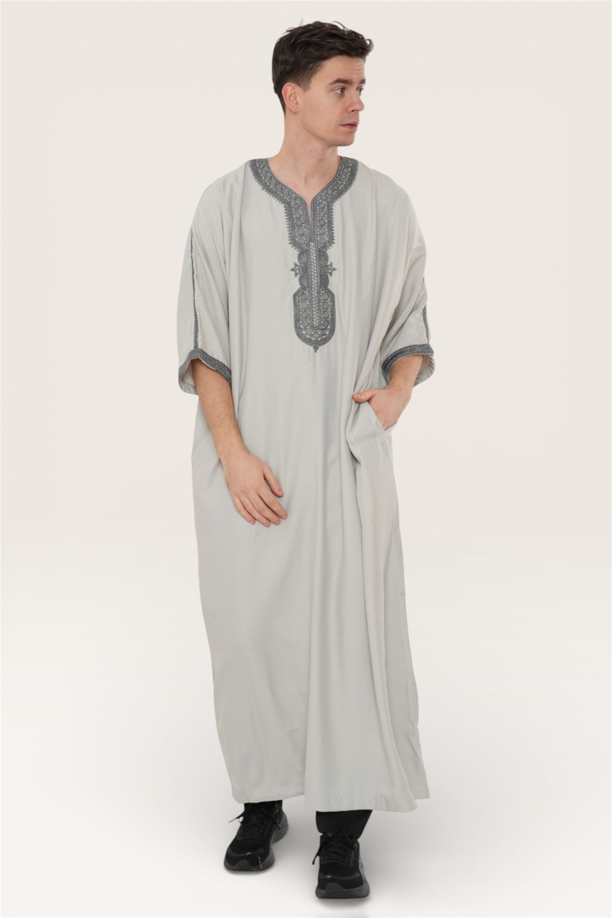 Experience traditional elegance with the Moroccan thobe HM65, designed to combine cultural heritage with modern comfort. Featuring detailed embroidery and a breathable short-sleeve design, this thobe delivers style and practicality. Crafted from a premium polyester-viscose blend, it offers durability, softness, and easy care, making it perfect for Eid, prayers, weddings, and special occasions.