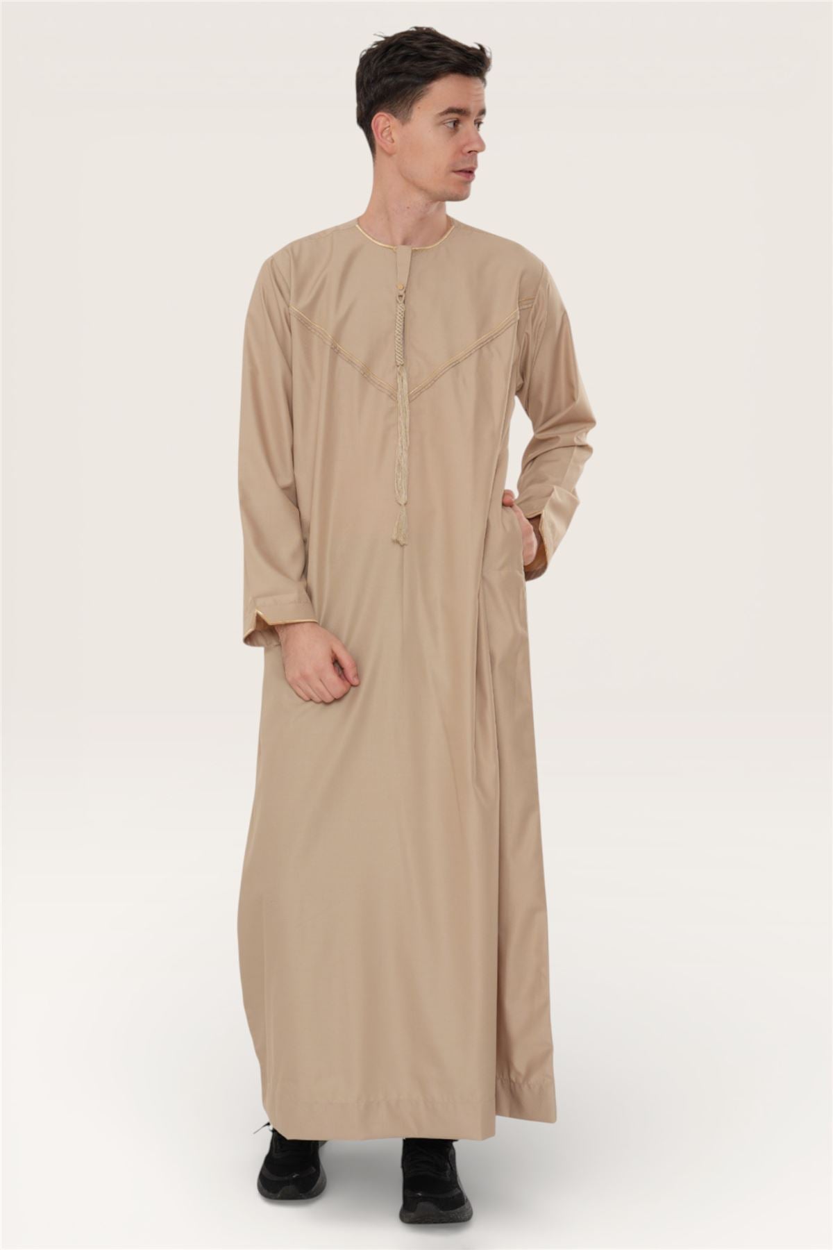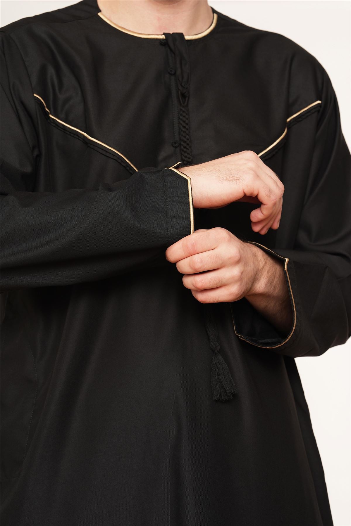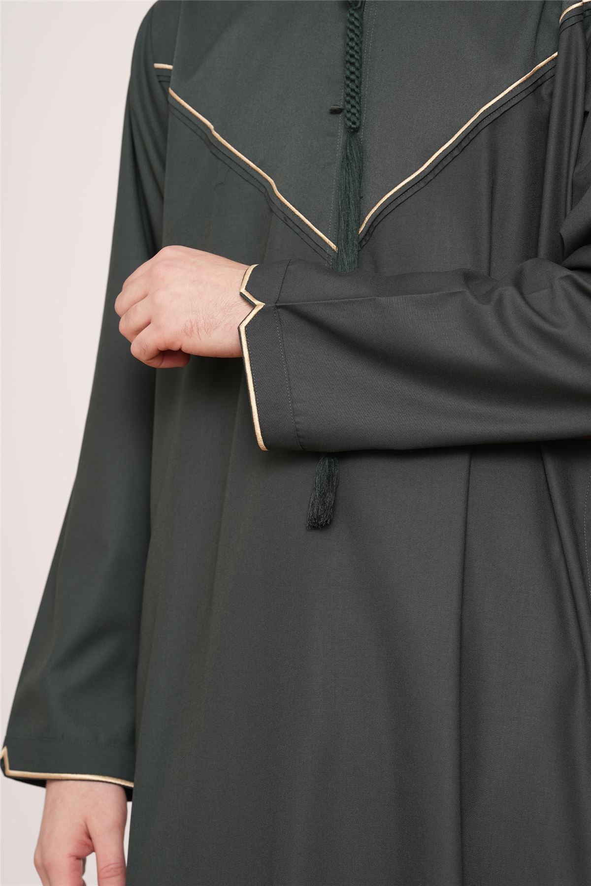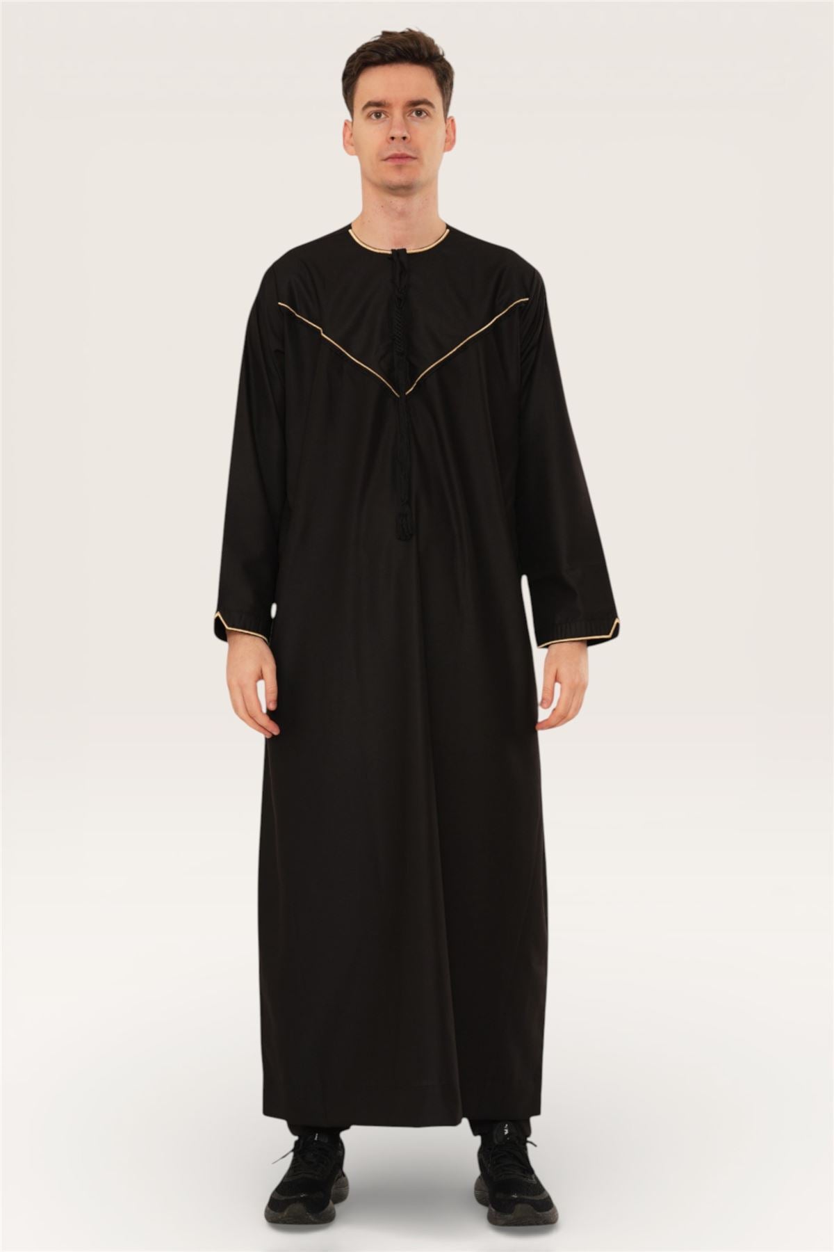 The TT-007 Moroccan thobe blends classic tradition with subtle modern detailing. Featuring a clean round neckline with tassel tie and elegant contrast piping across the chest and cuffs, it offers a refined yet understated look. Crafted from a soft polyester-viscose blend, this thobe provides a smooth drape, breathable comfort, and effortless wear for daily use and prayer.