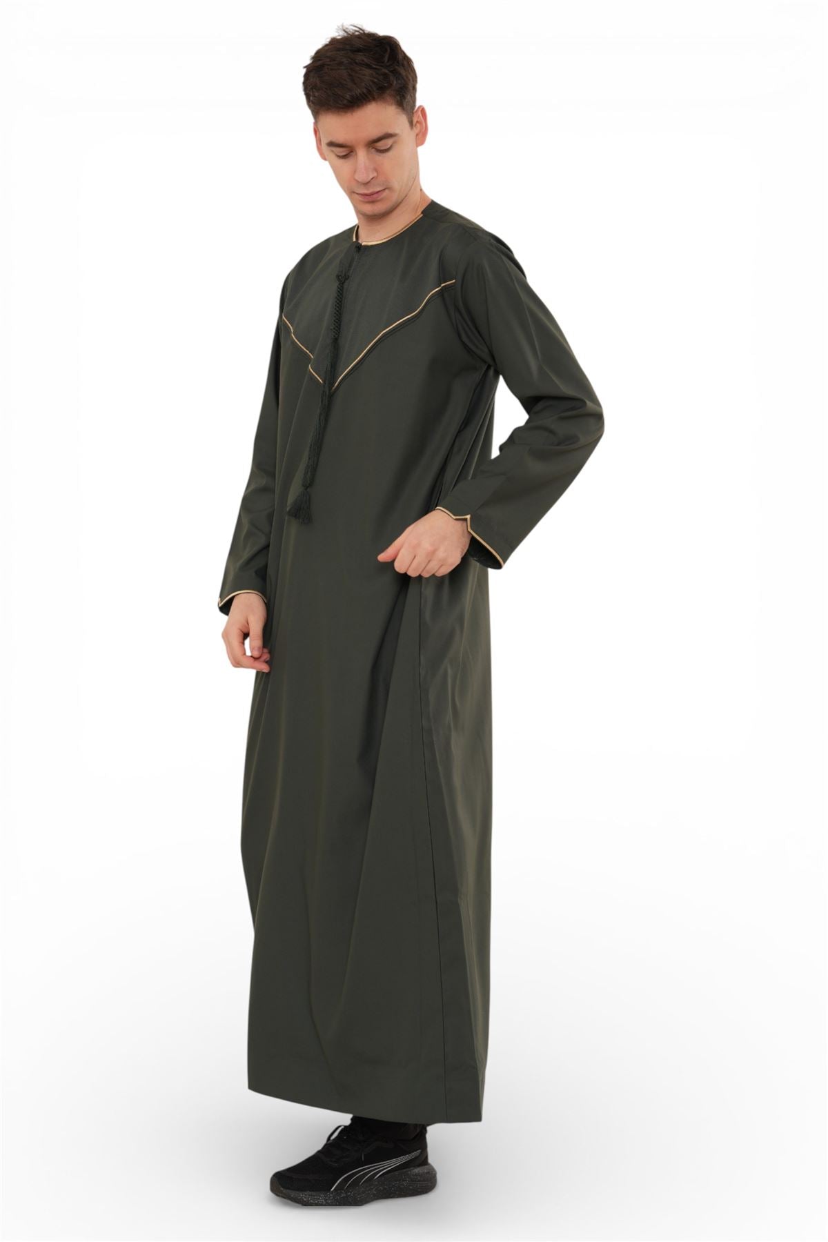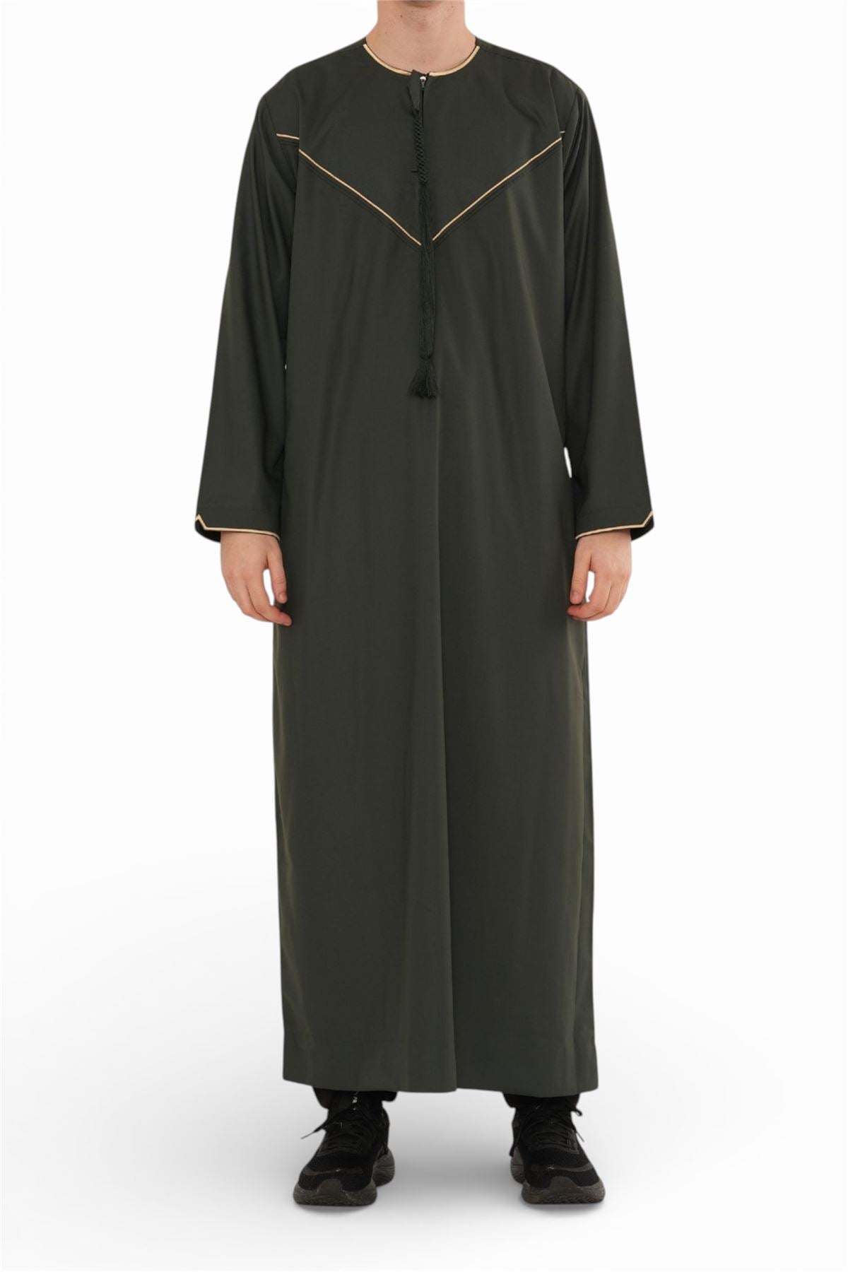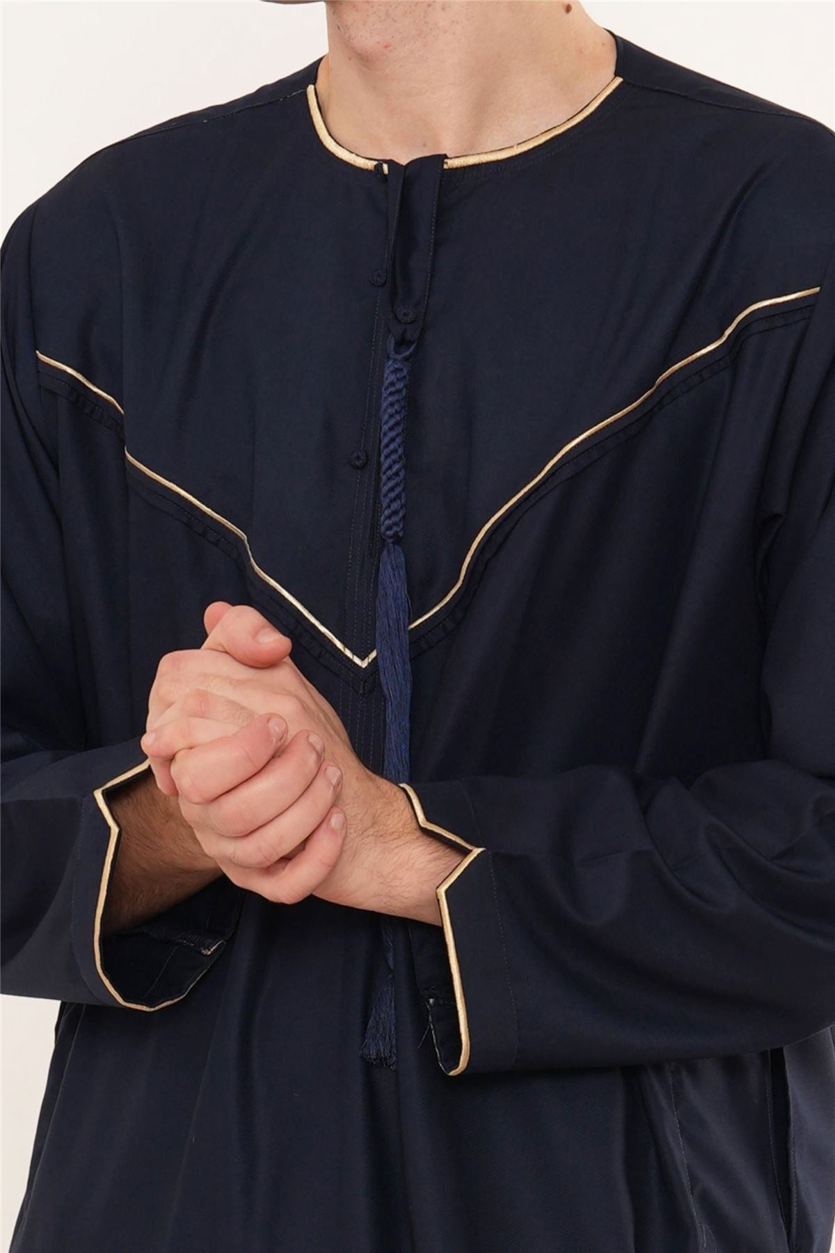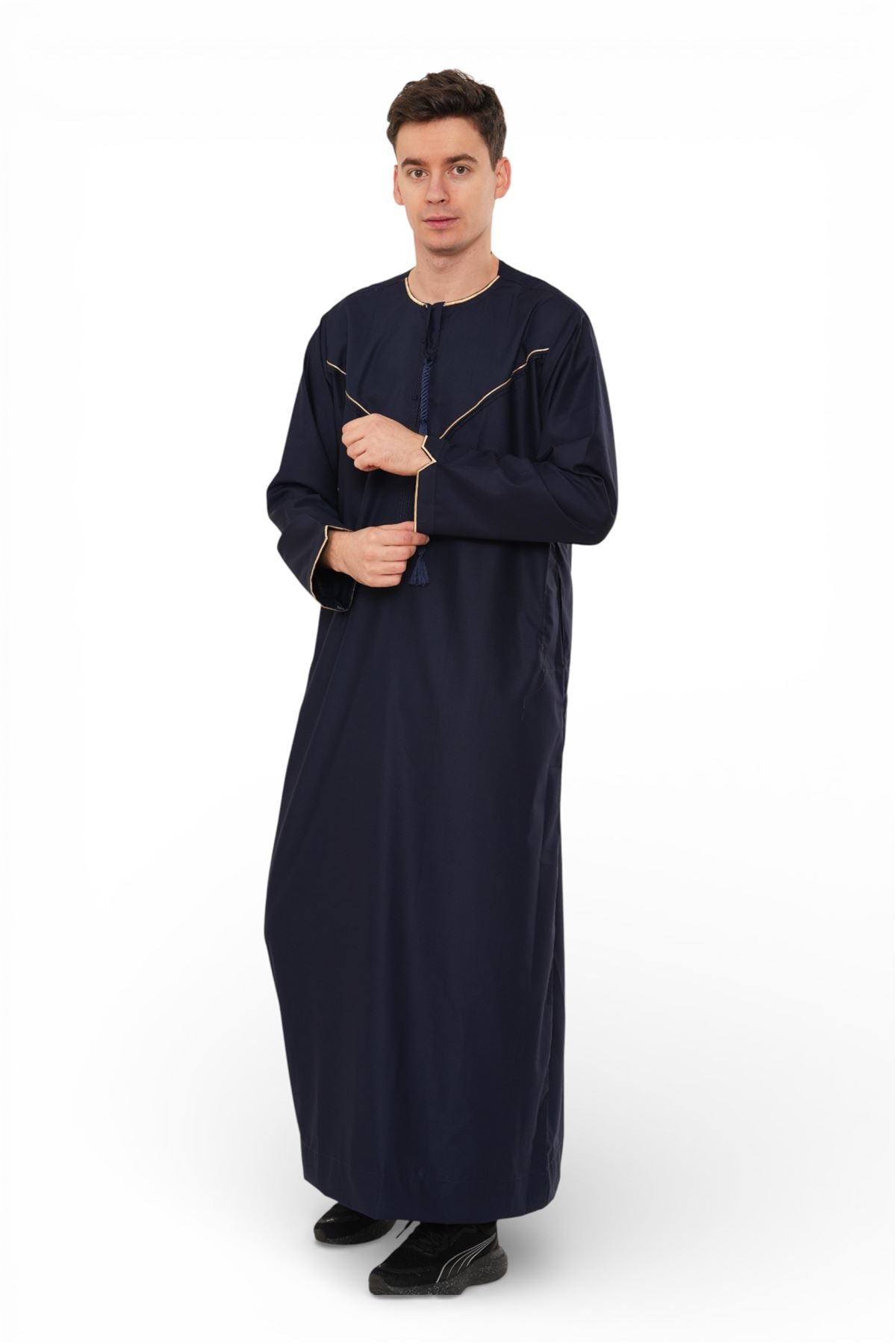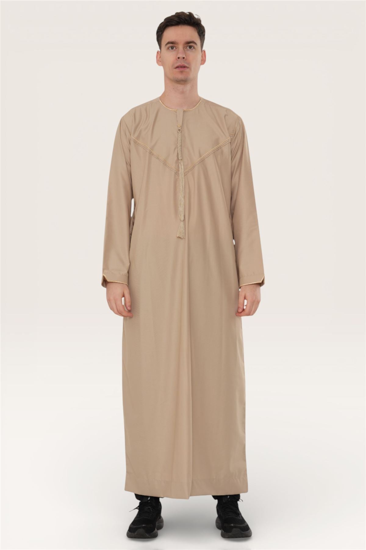 The TT-007 Moroccan thobe blends classic tradition with subtle modern detailing. Featuring a clean round neckline with tassel tie and elegant contrast piping across the chest and cuffs, it offers a refined yet understated look. Crafted from a soft polyester-viscose blend, this thobe provides a smooth drape, breathable comfort, and effortless wear for daily use and prayer.