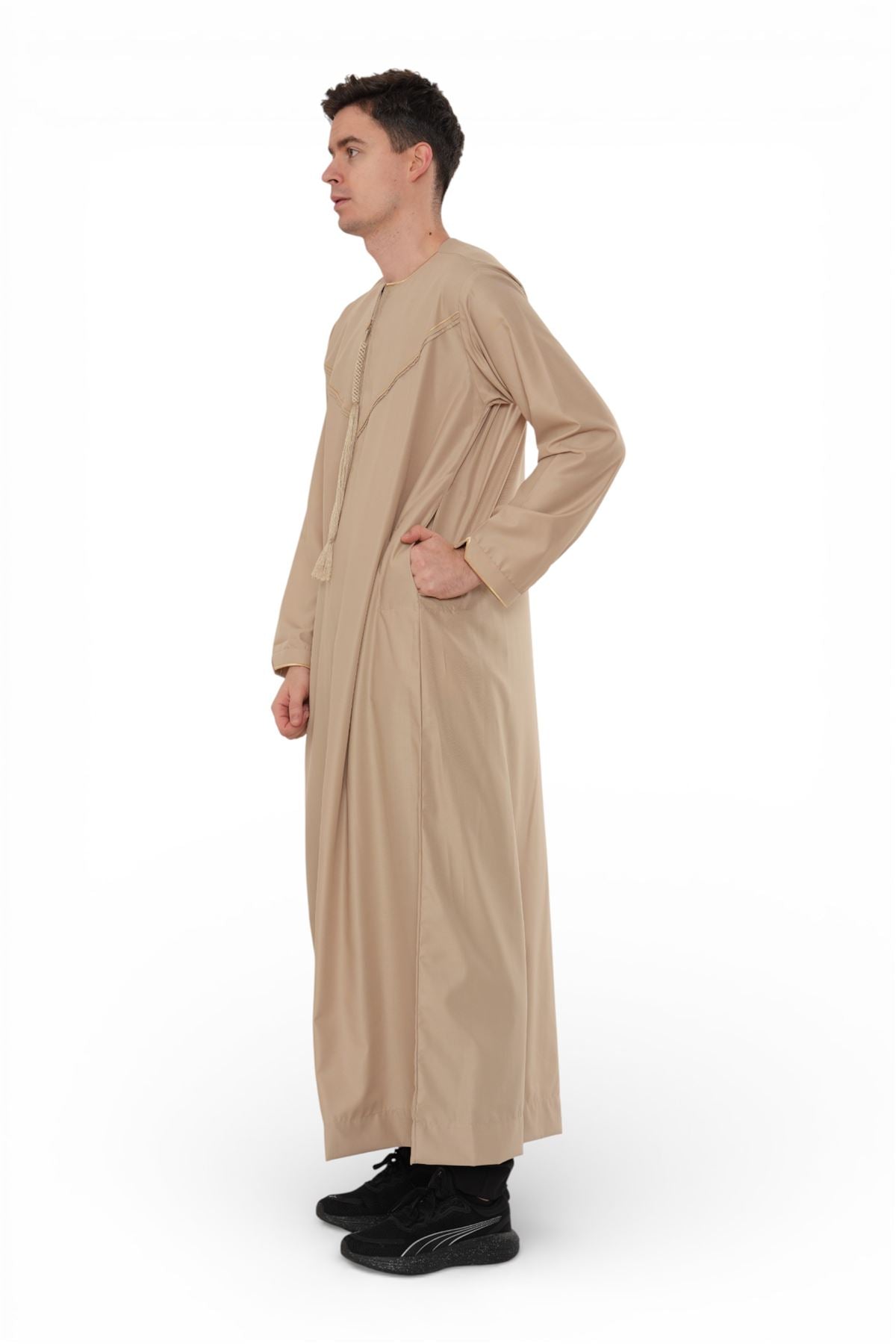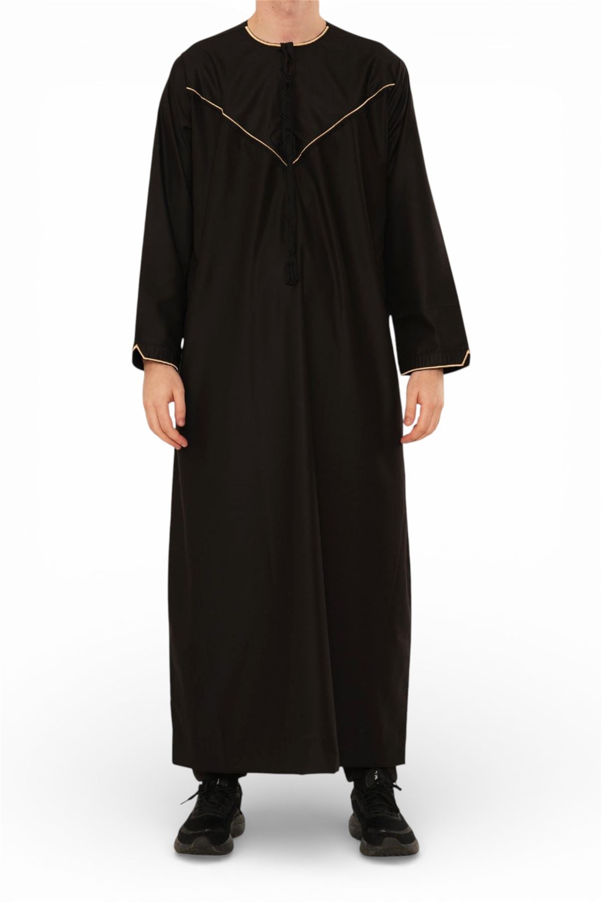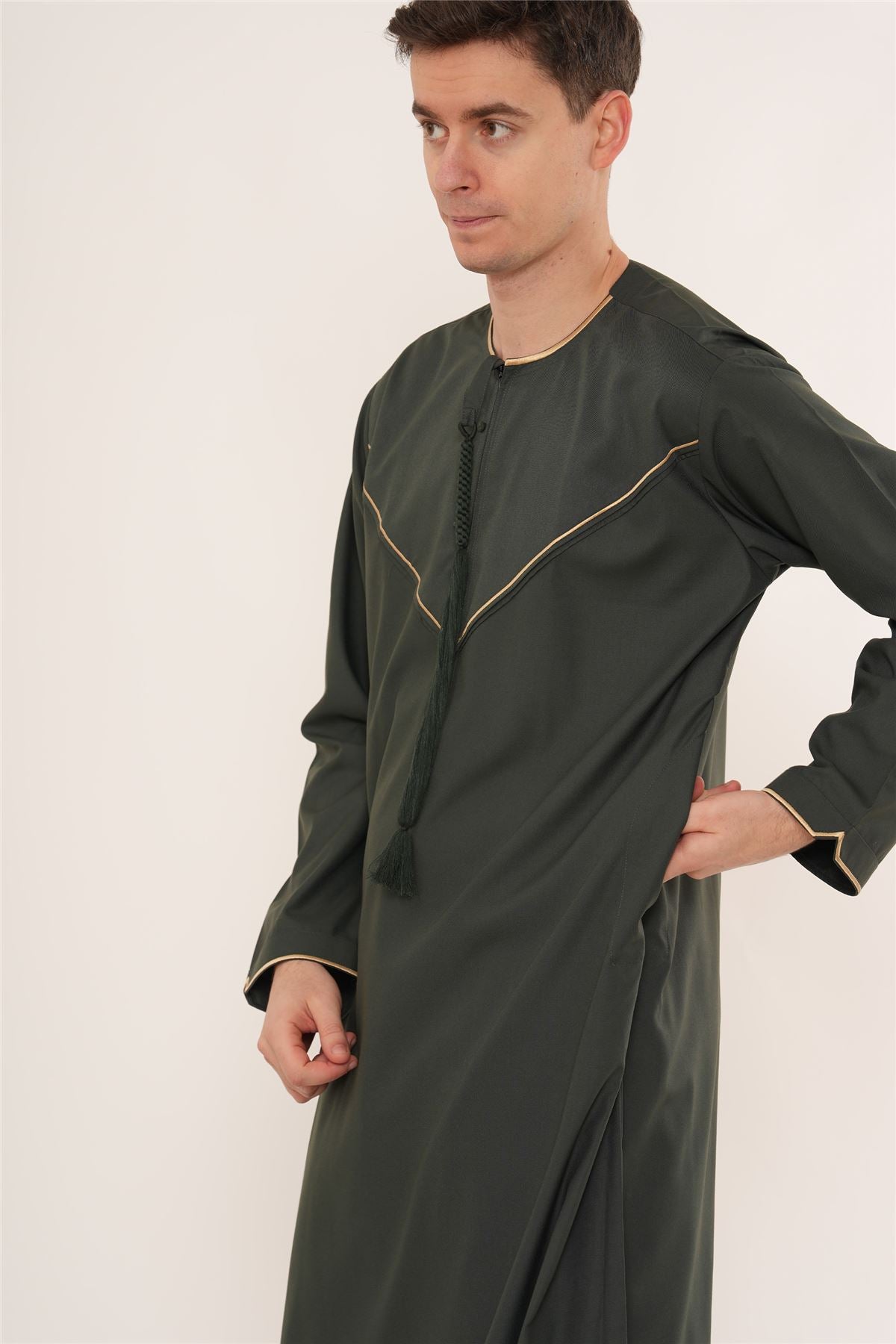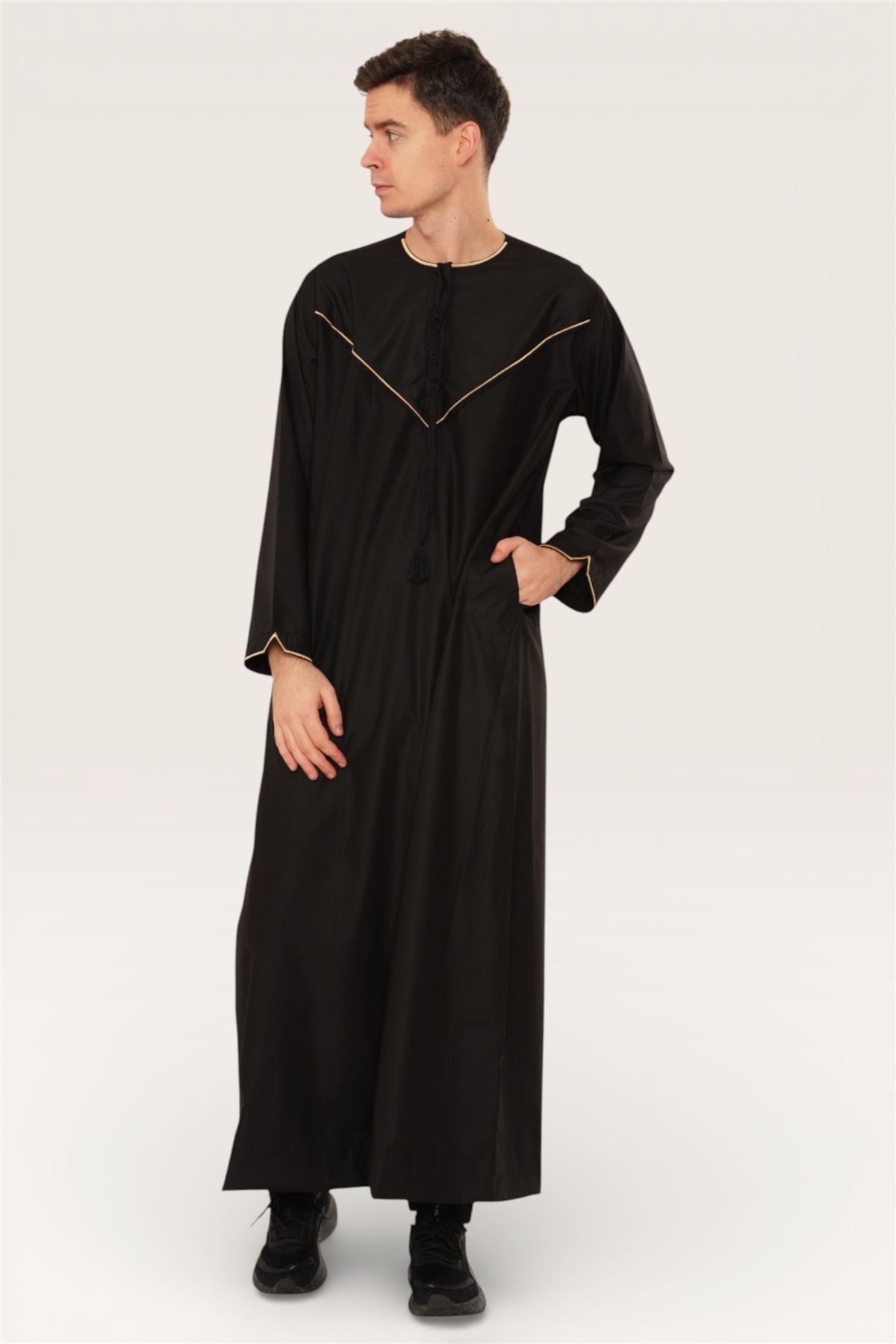 The TT-007 Moroccan thobe blends classic tradition with subtle modern detailing. Featuring a clean round neckline with tassel tie and elegant contrast piping across the chest and cuffs, it offers a refined yet understated look. Crafted from a soft polyester-viscose blend, this thobe provides a smooth drape, breathable comfort, and effortless wear for daily use and prayer.