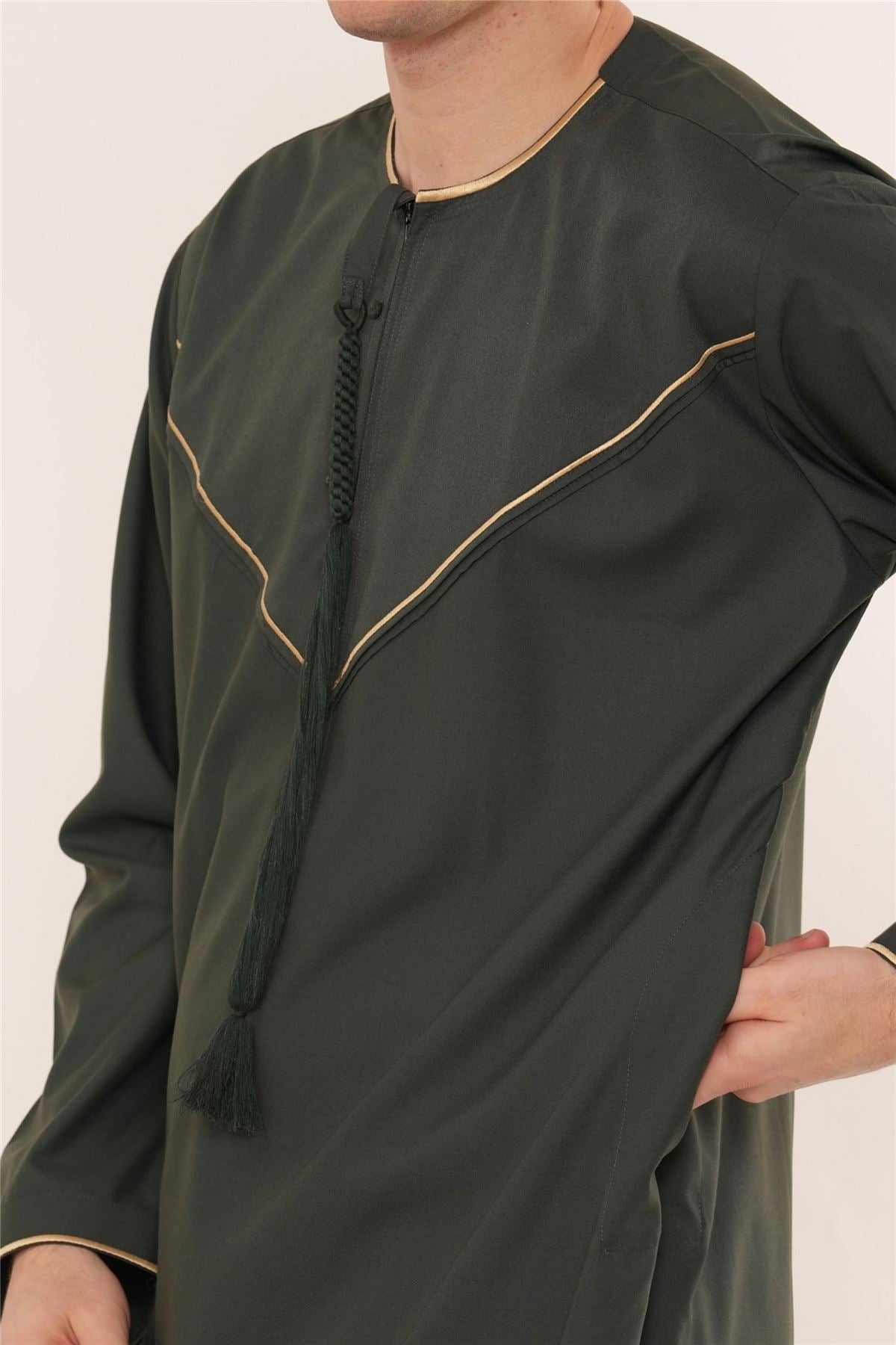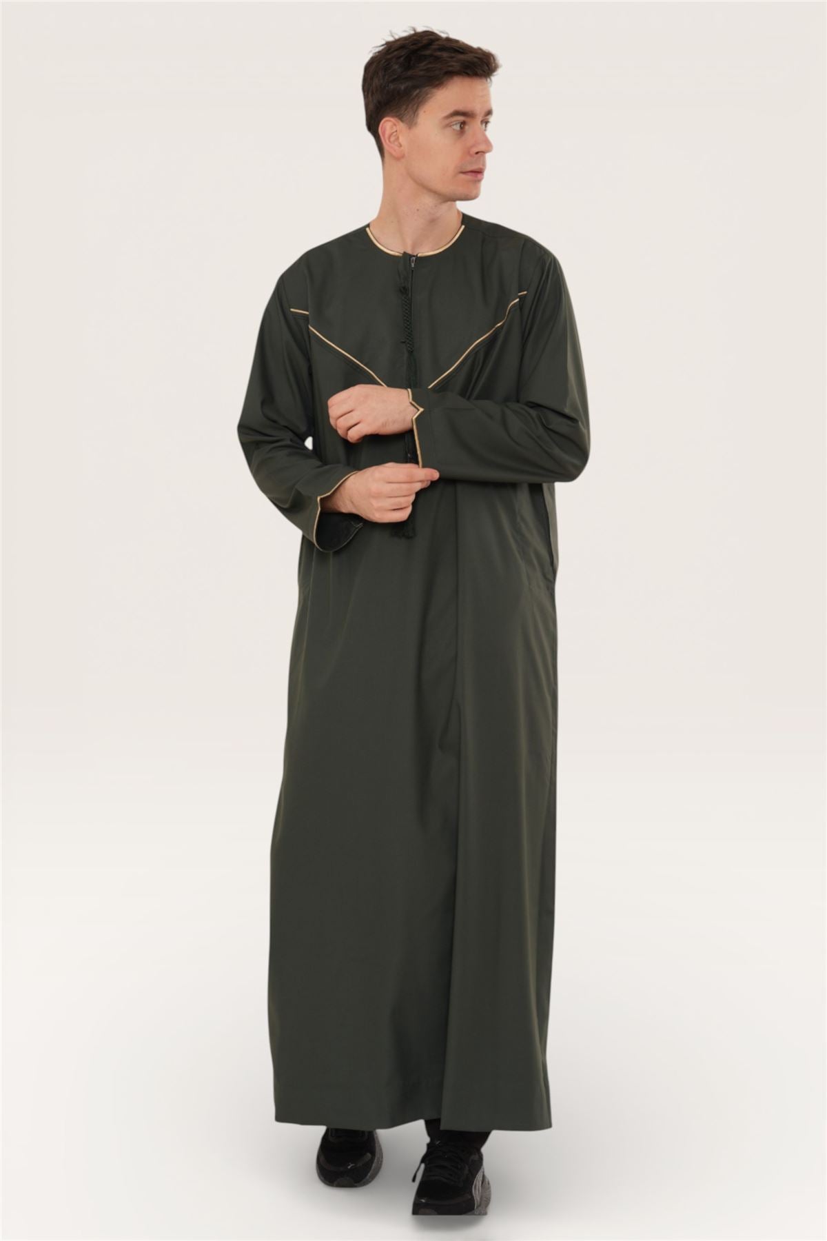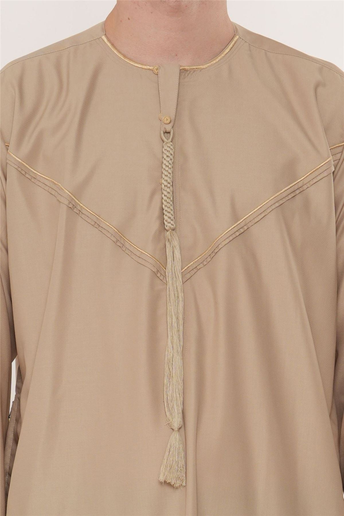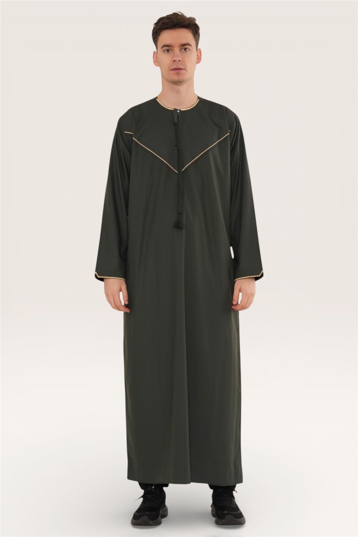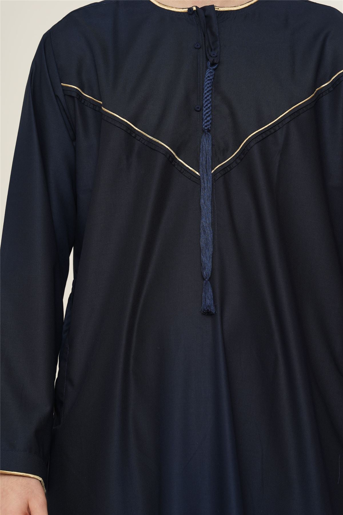 The TT-007 Moroccan thobe blends classic tradition with subtle modern detailing. Featuring a clean round neckline with tassel tie and elegant contrast piping across the chest and cuffs, it offers a refined yet understated look. Crafted from a soft polyester-viscose blend, this thobe provides a smooth drape, breathable comfort, and effortless wear for daily use and prayer.