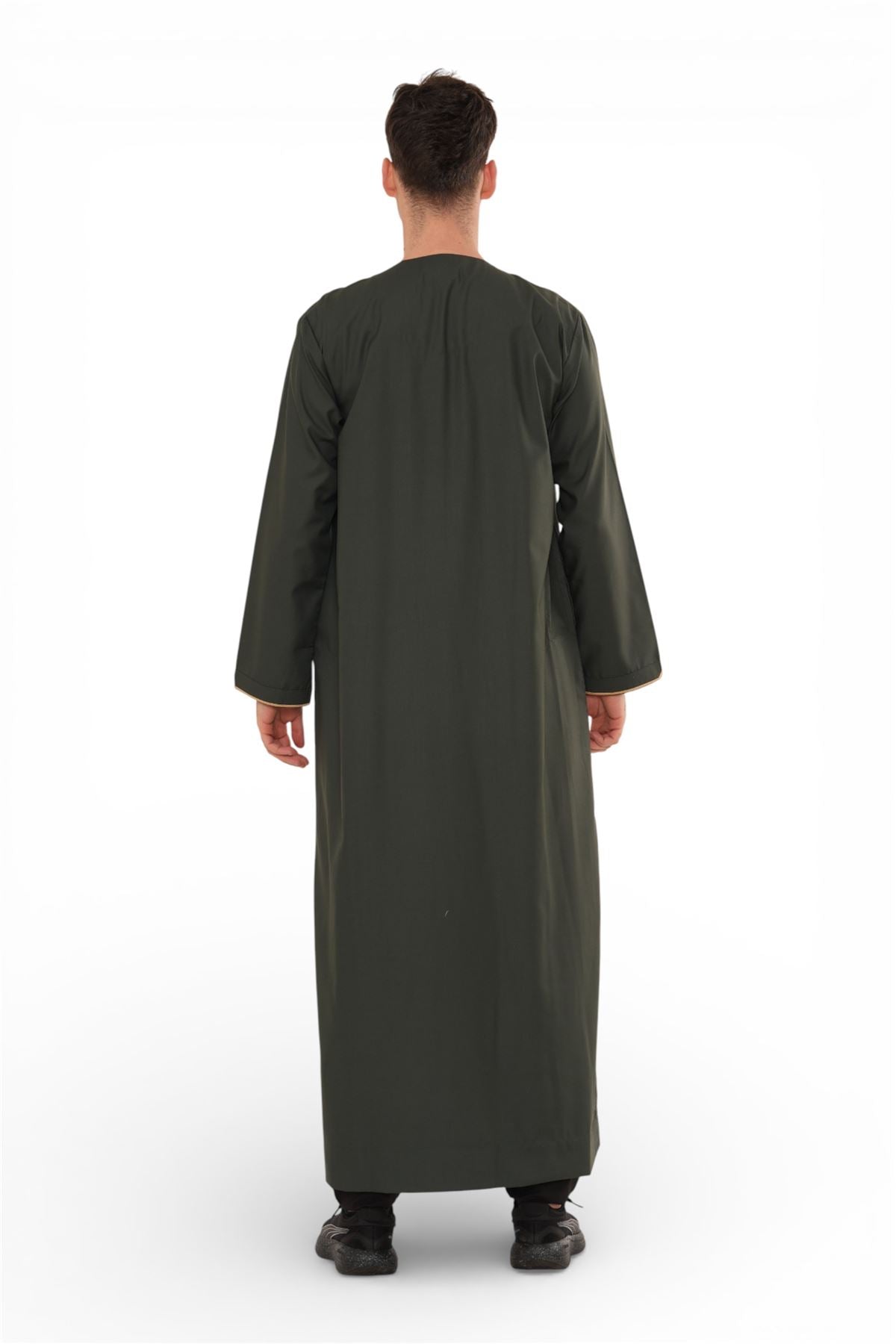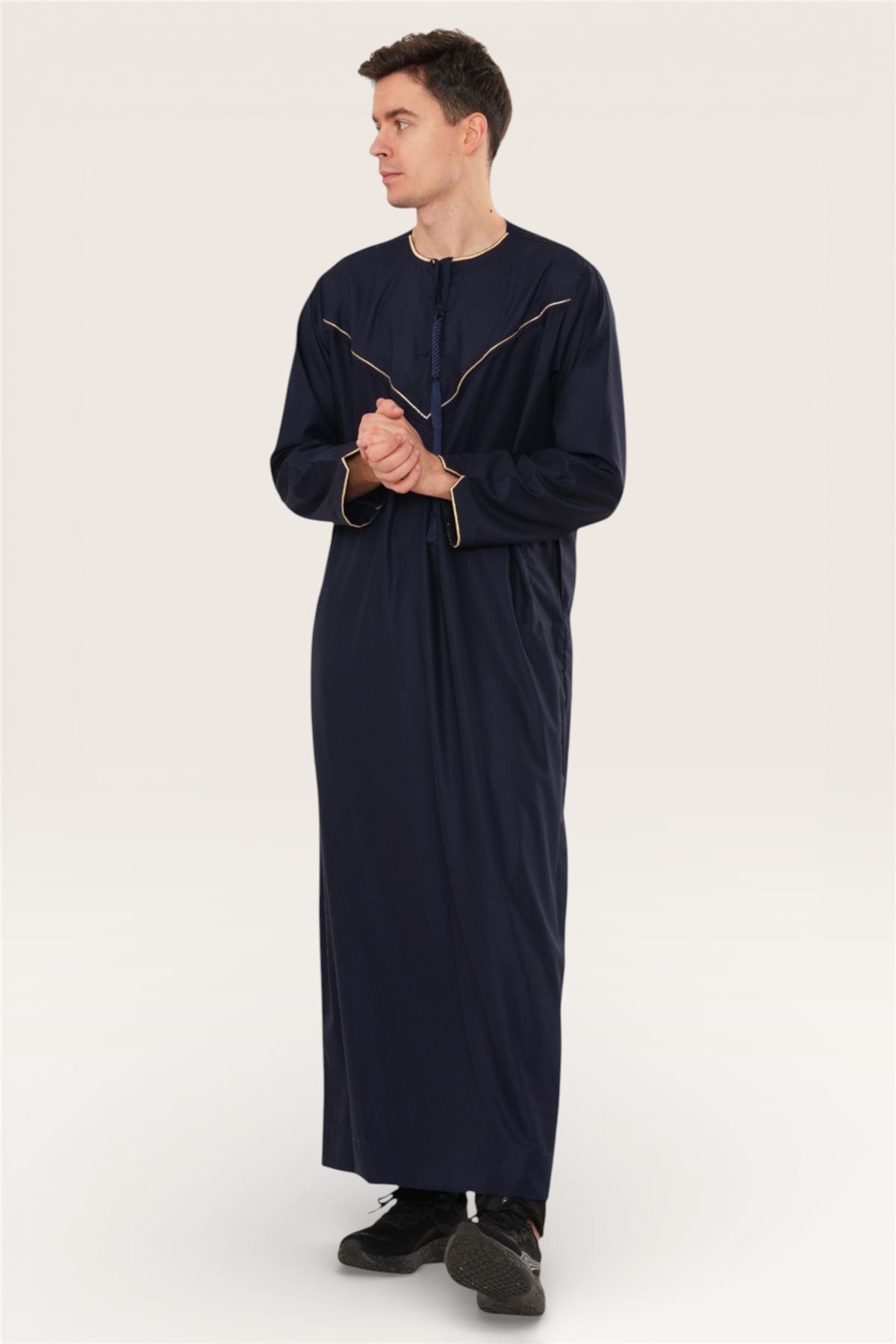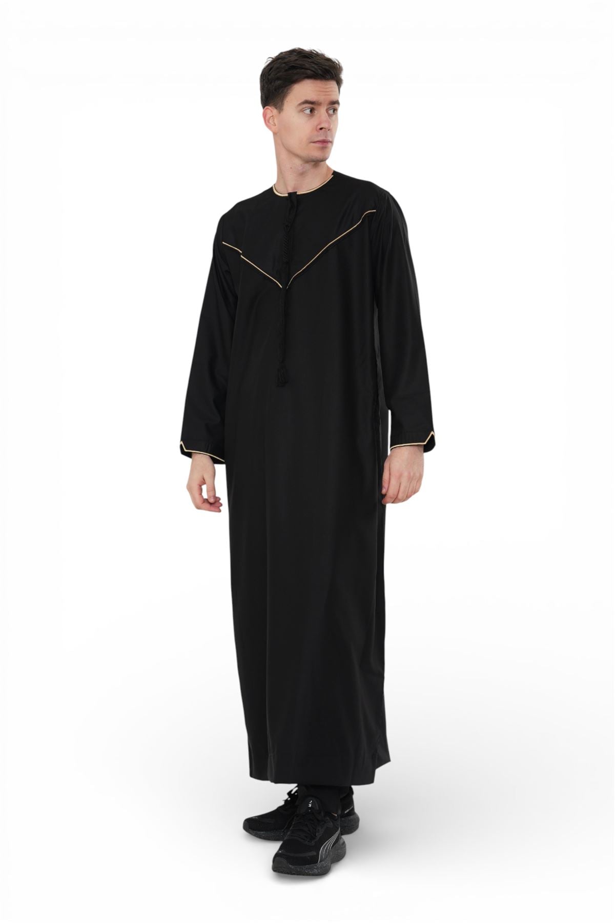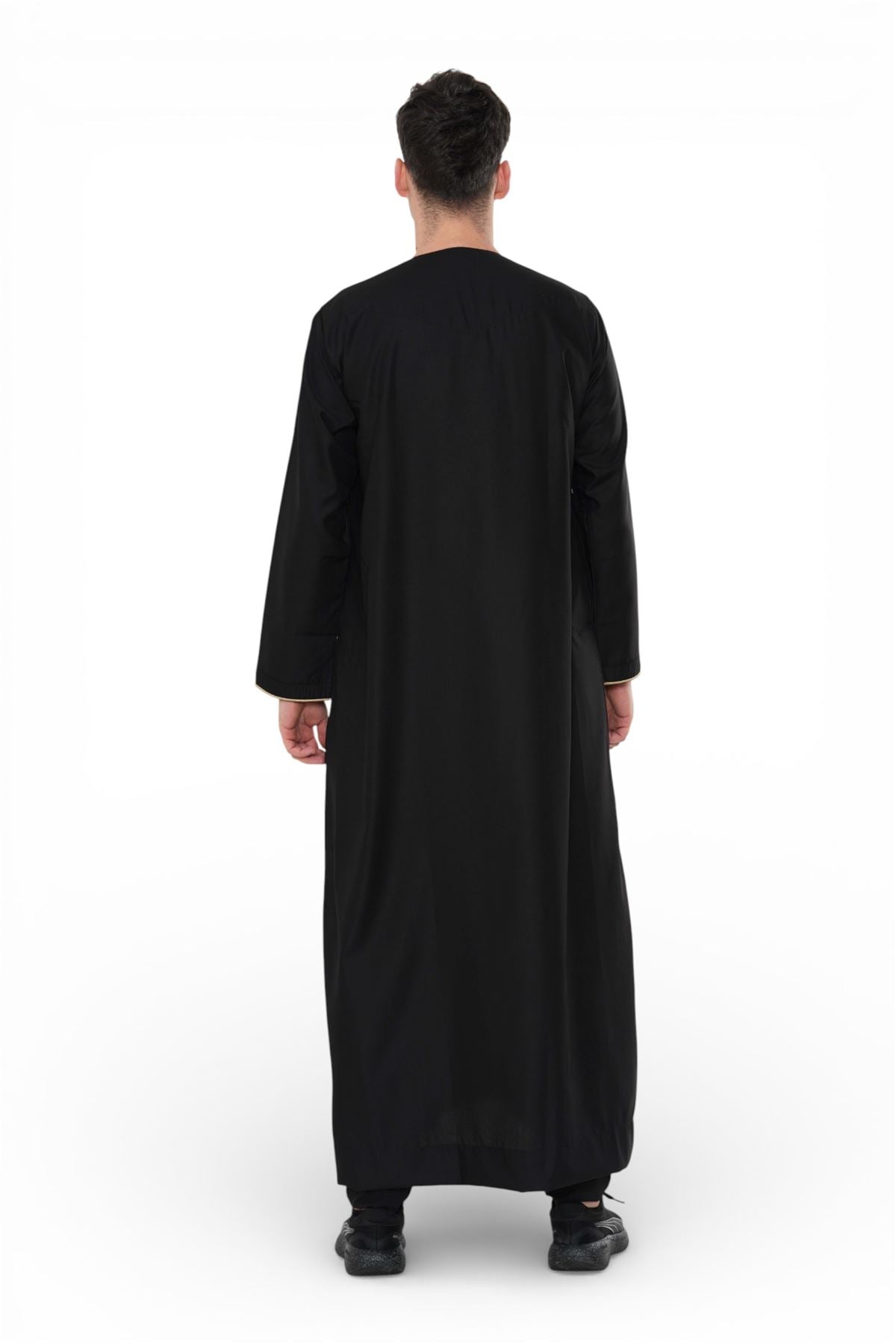 The TT-007 Moroccan thobe blends classic tradition with subtle modern detailing. Featuring a clean round neckline with tassel tie and elegant contrast piping across the chest and cuffs, it offers a refined yet understated look. Crafted from a soft polyester-viscose blend, this thobe provides a smooth drape, breathable comfort, and effortless wear for daily use and prayer.