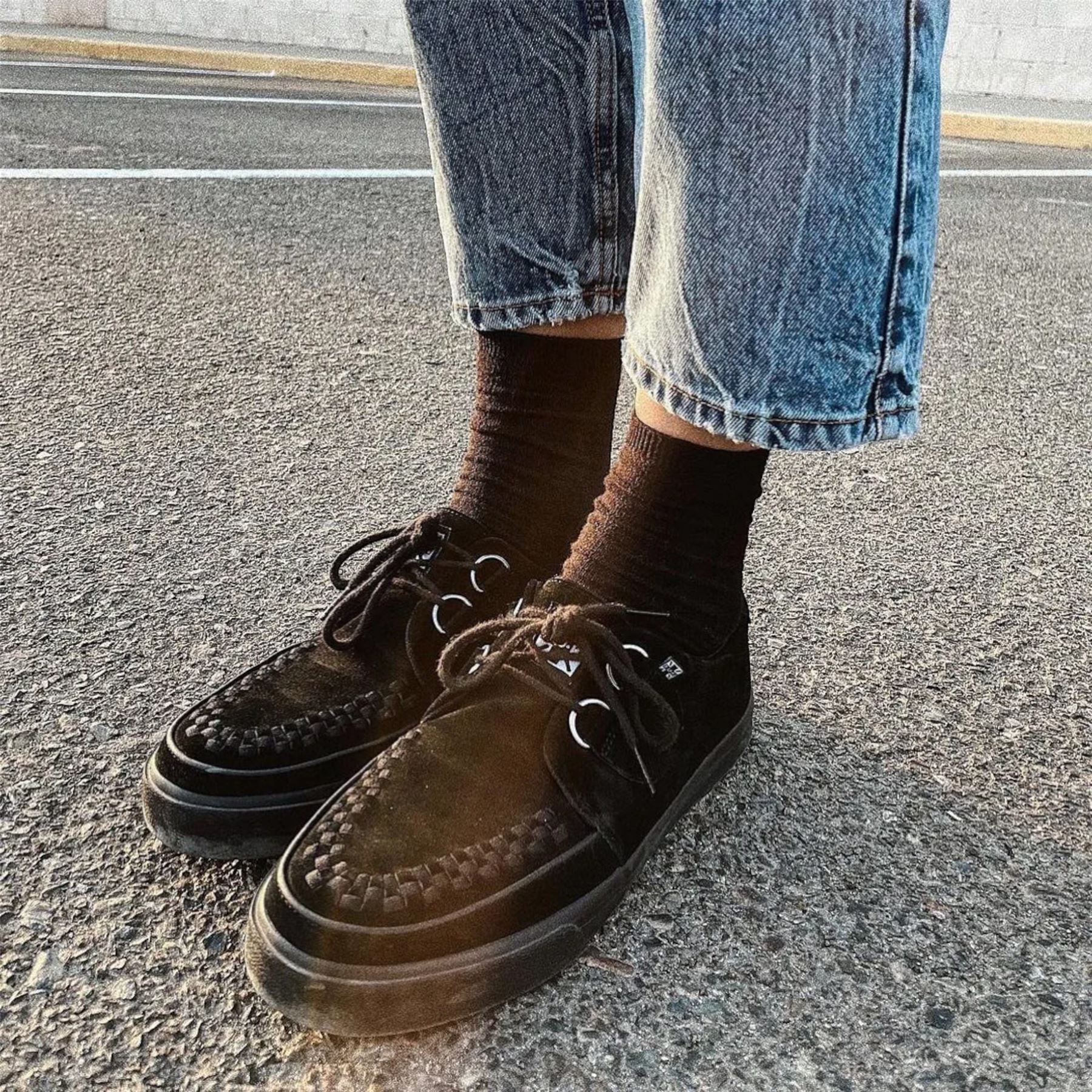 The Black Suede Creeper Sneaker blends classic creeper style with everyday comfort. Made with a high-quality suede upper and detailed interlace, it sits on a distinctive flat skull & bones sole and includes a removable memory foam insole for all-day wear. Versatile enough for daily outfits, these sneakers combine alternative edge with durable, comfortable design.