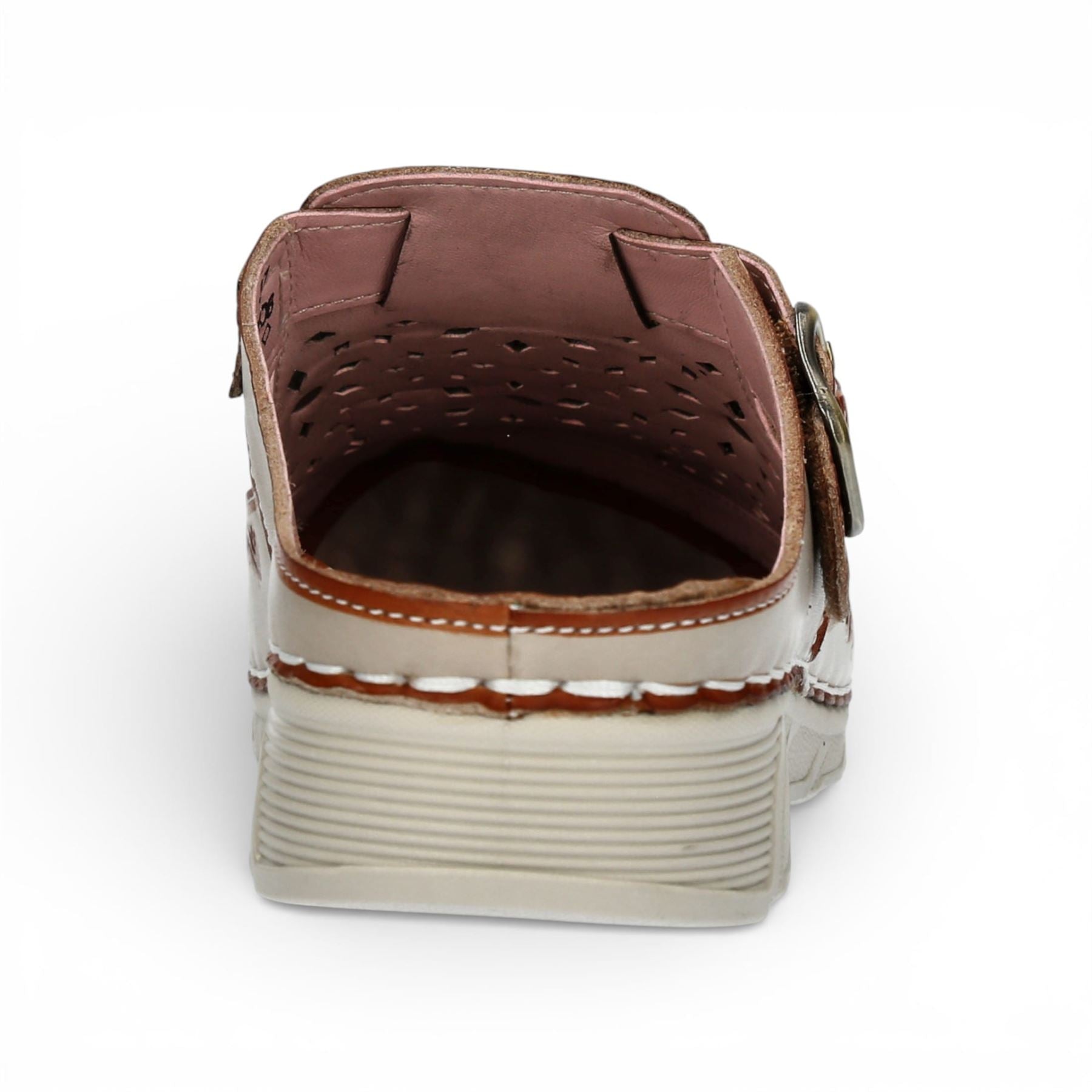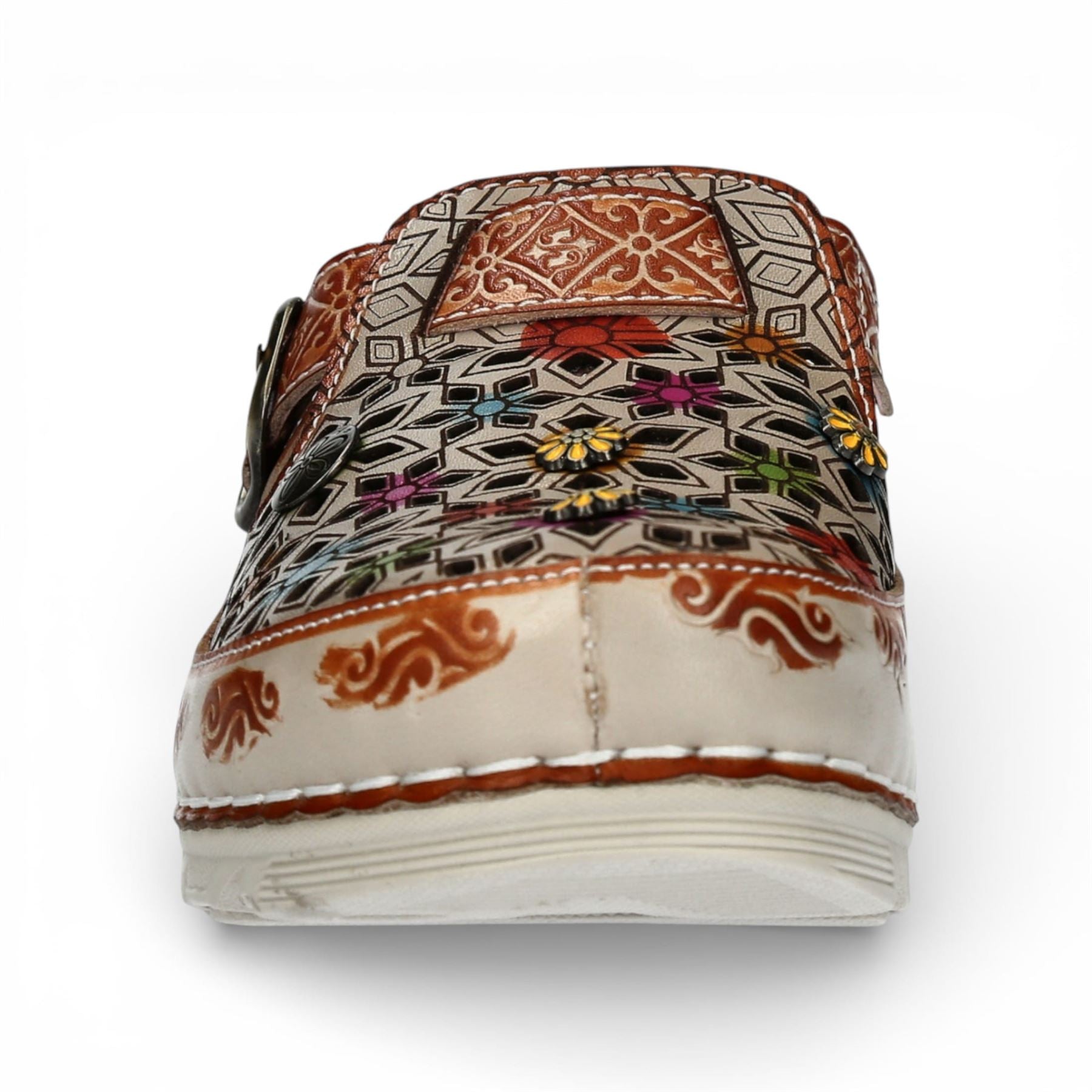 Step into everyday elegance with Laura Vita Dorry 01 Floral Leather Slipper Sandals. Crafted from premium leather, they feature a cushioned leather insole, soft polyurethane lining, and stable wedge heel. The floral upper adds charm, while the slip-on Velcro design ensures comfort, support, and effortless wear from morning to evening, with reliable grip, balanced height, and lasting durability for confidence.