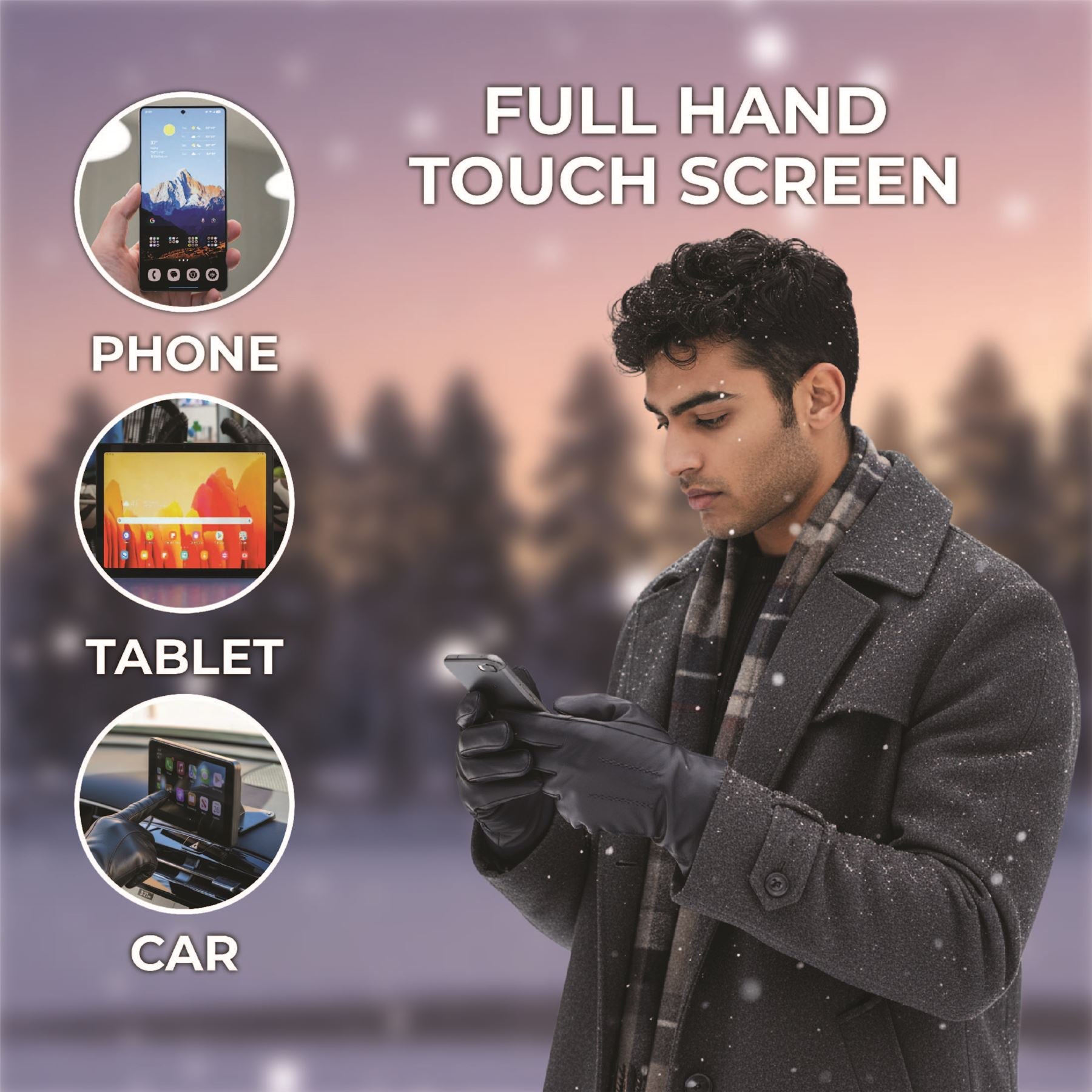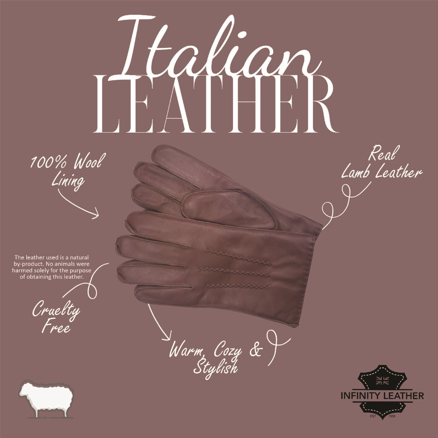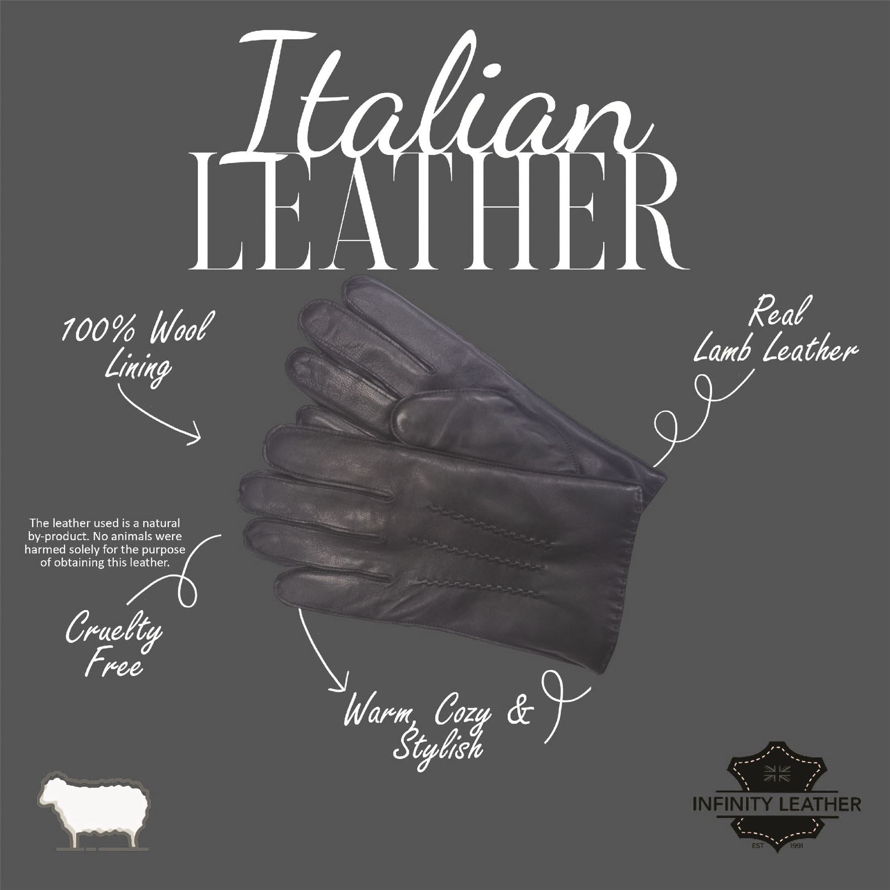 Refined craftsmanship meets practicality in Infinity Leather Men’s Italian Gloves. Designed with elegant stitch detailing, these soft, water-resistant leather gloves feature touchscreen compatibility and a warm wool lining, offering comfort, sophistication, and protection for driving or daily winter wear.