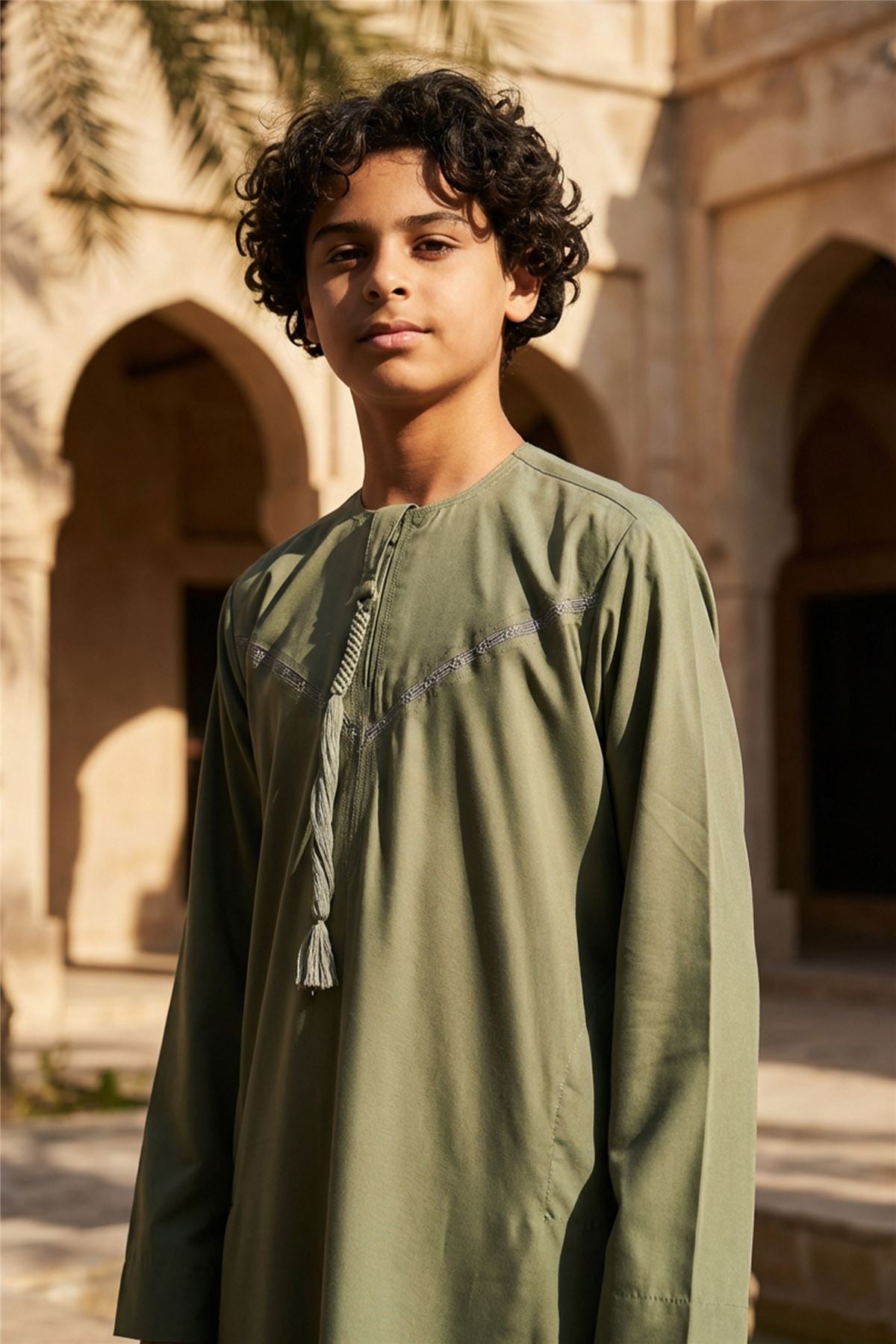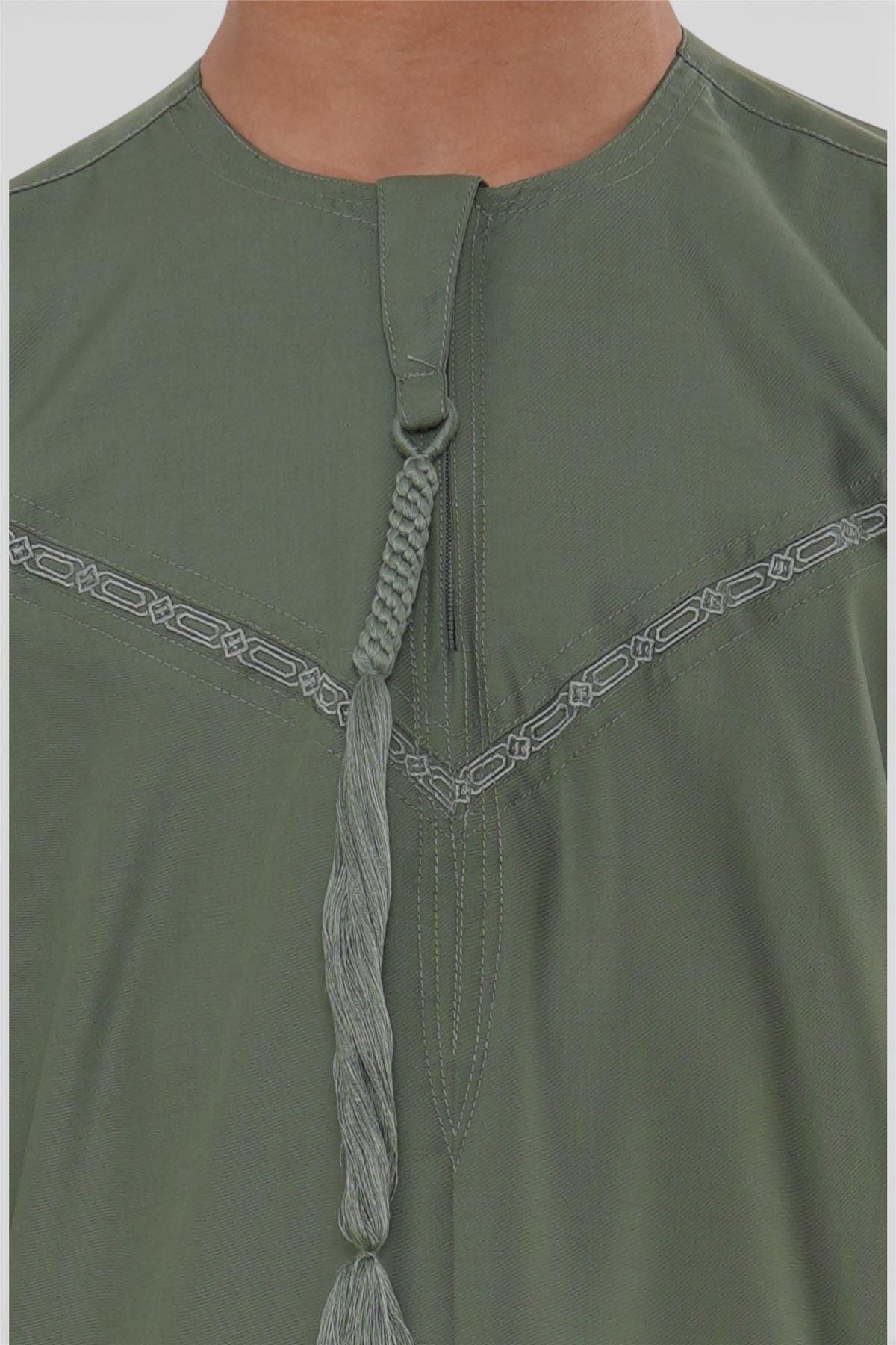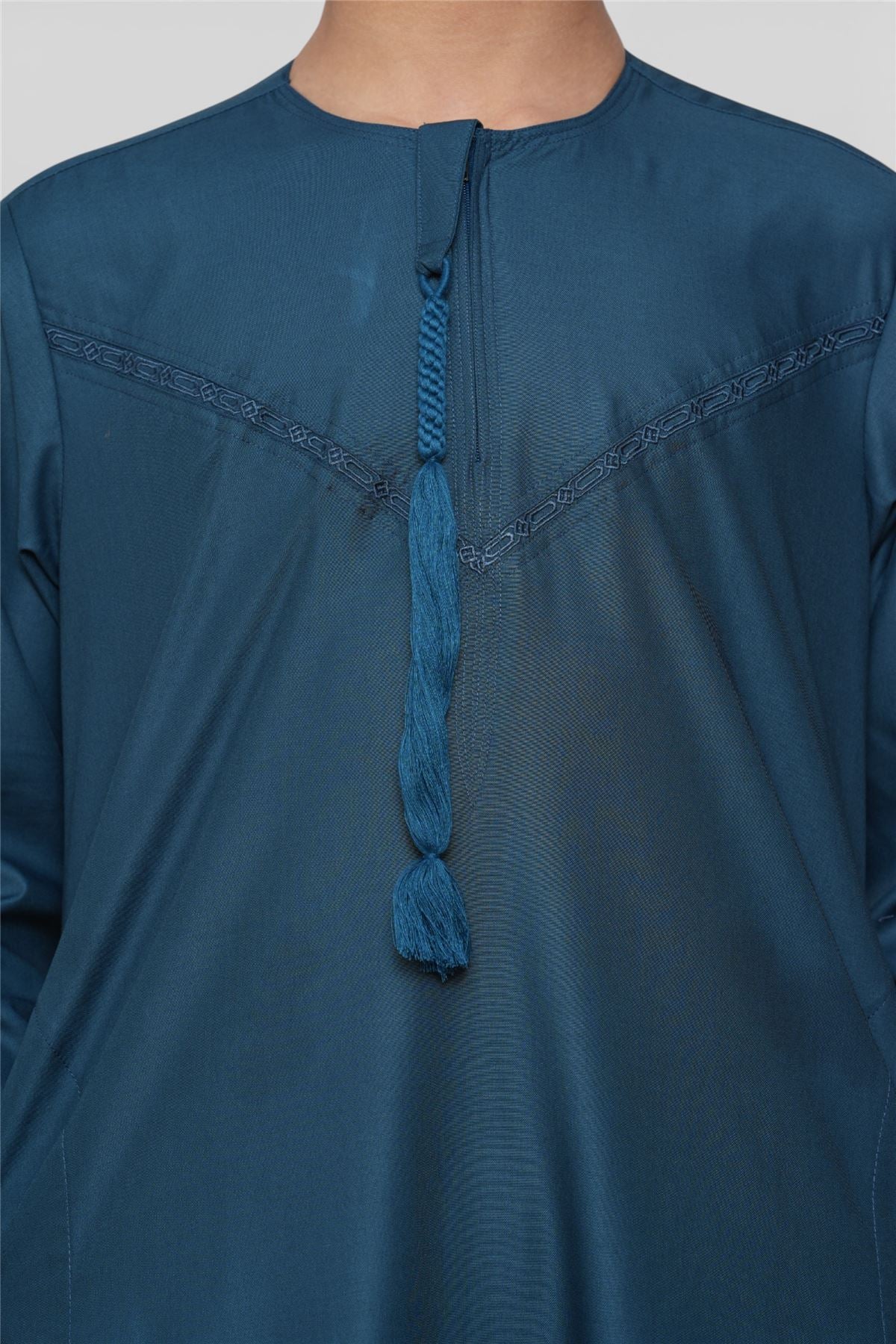The K-TT-008 Moroccan thobe for kids is designed with refined simplicity and thoughtful detailing. Accented with elegant contrast piping across the chest and cuffs, and finished with a classic round neckline and tassel tie, it delivers a sophisticated yet modest look. Crafted from a soft polyester-viscose blend, it offers a smooth drape, breathable comfort, and effortless wear for everyday use and prayer.