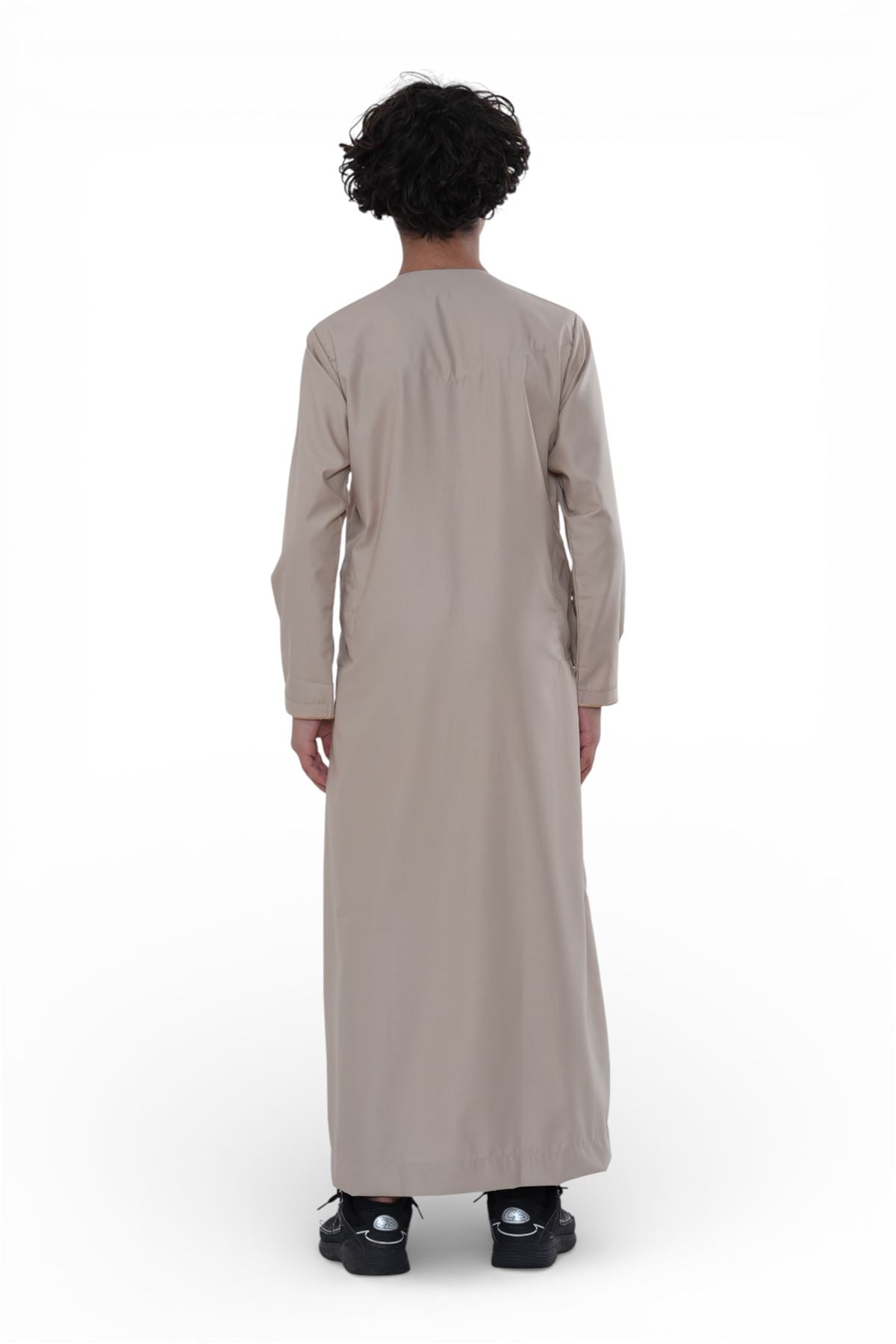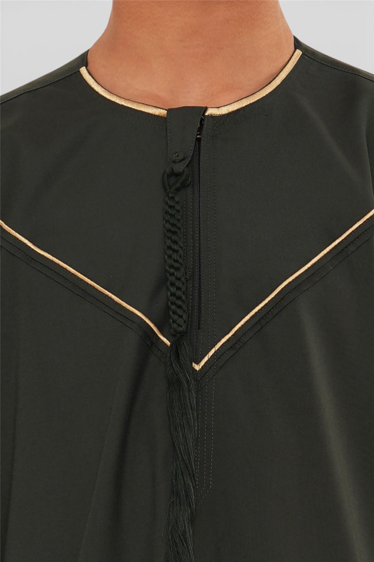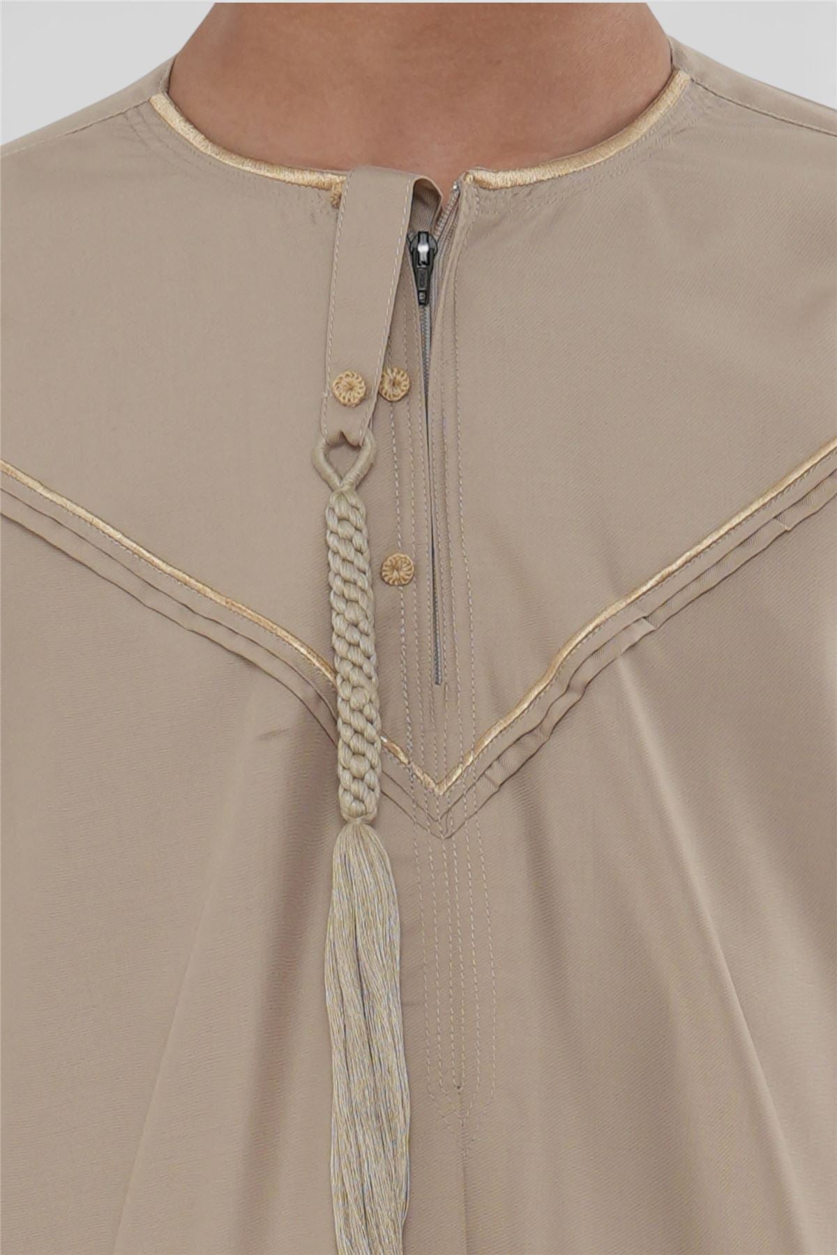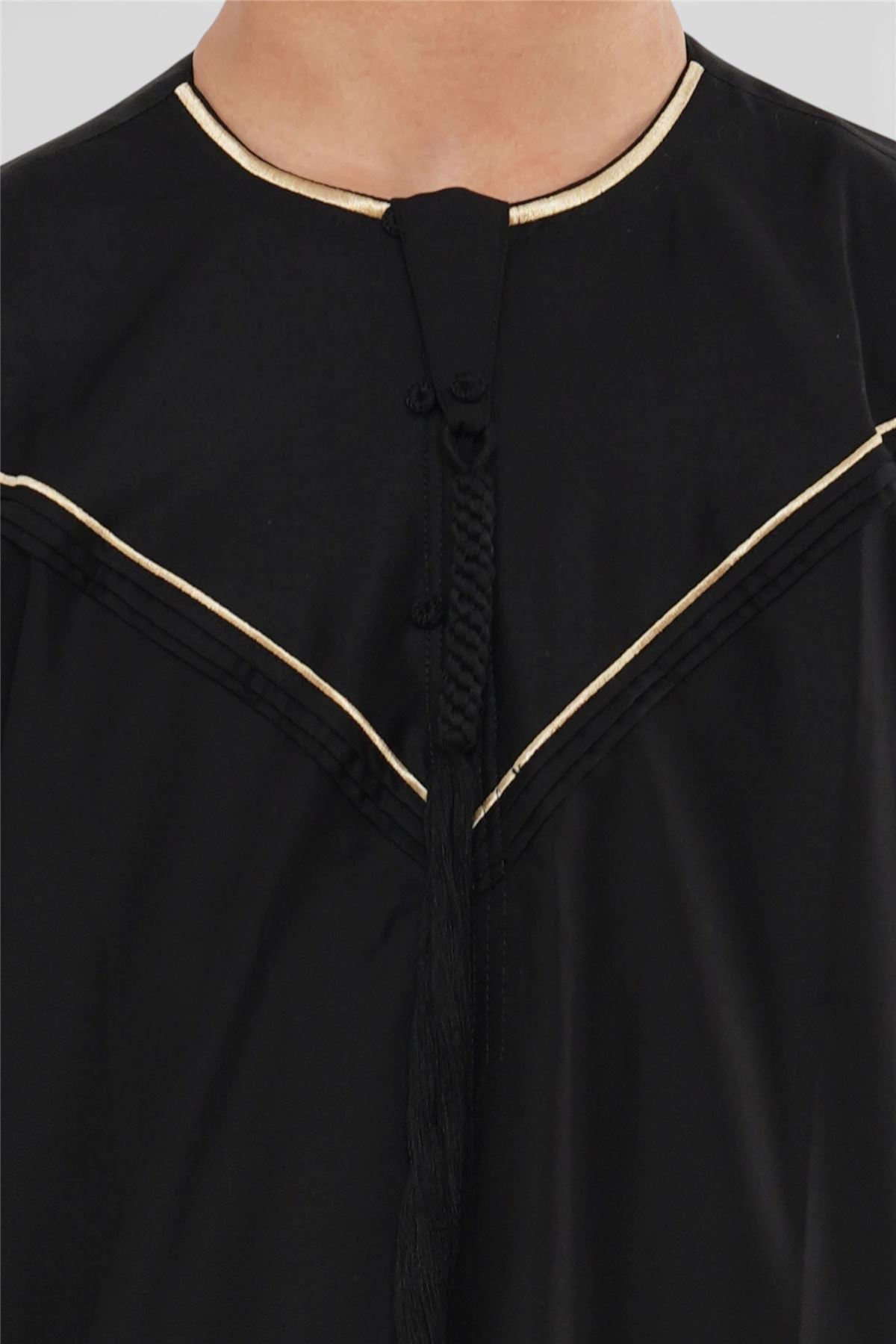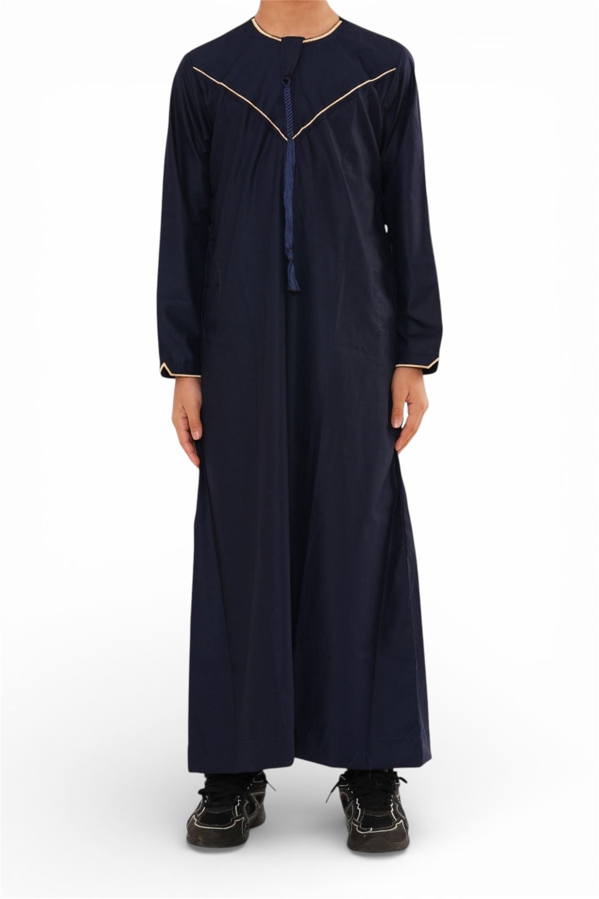The K-TT-007 Moroccan thobe for kids blends classic tradition with subtle modern detailing. Featuring a clean round neckline with tassel tie and elegant contrast piping across the chest and cuffs, it offers a refined yet understated look. Crafted from a soft polyester-viscose blend, this thobe provides a smooth drape, breathable comfort, and effortless wear for daily use and prayer.