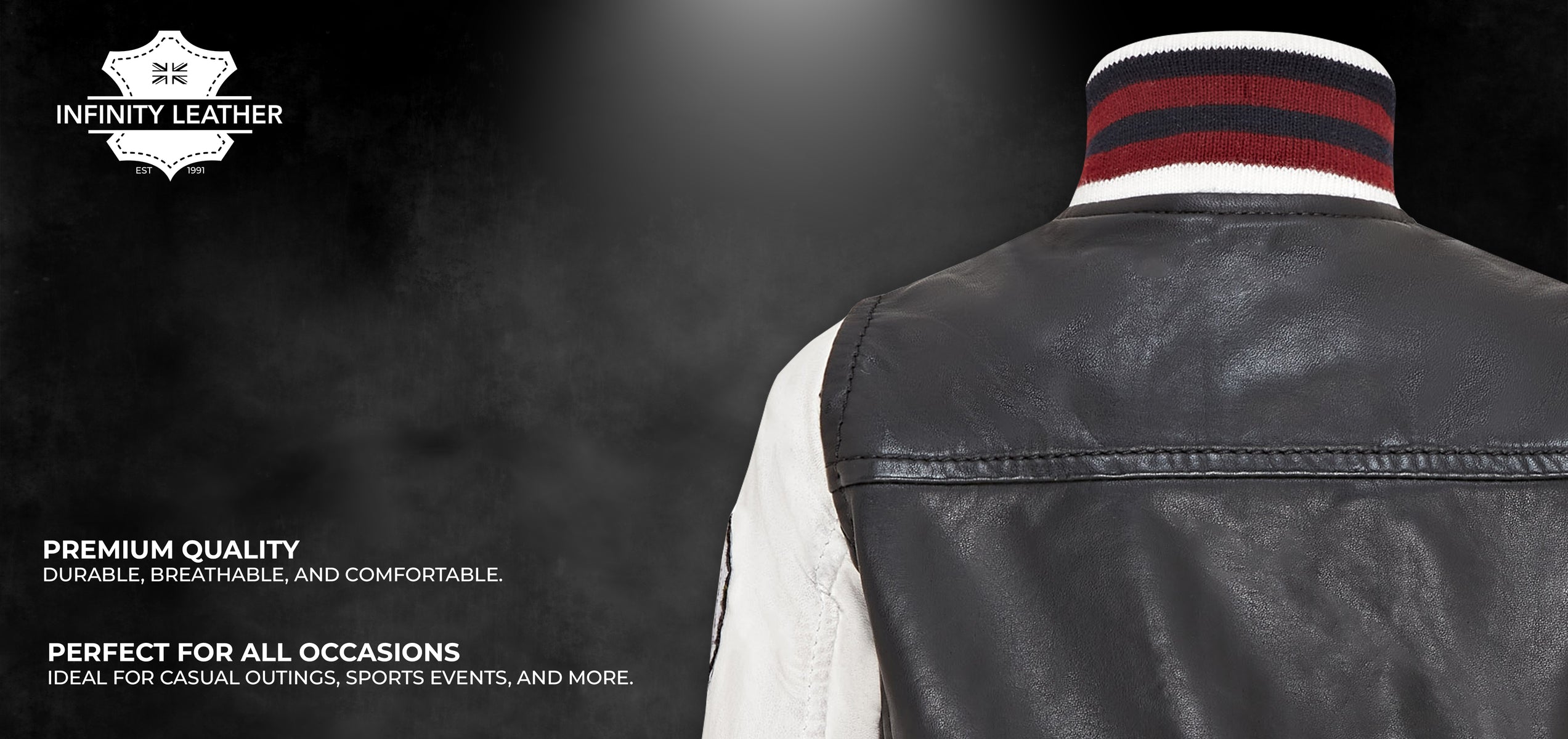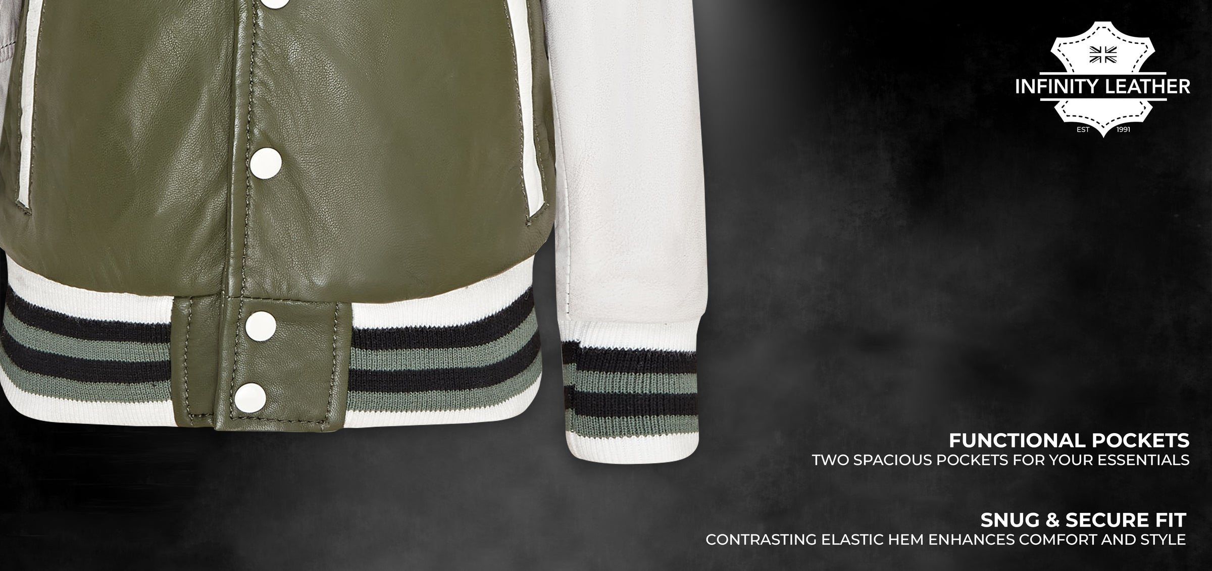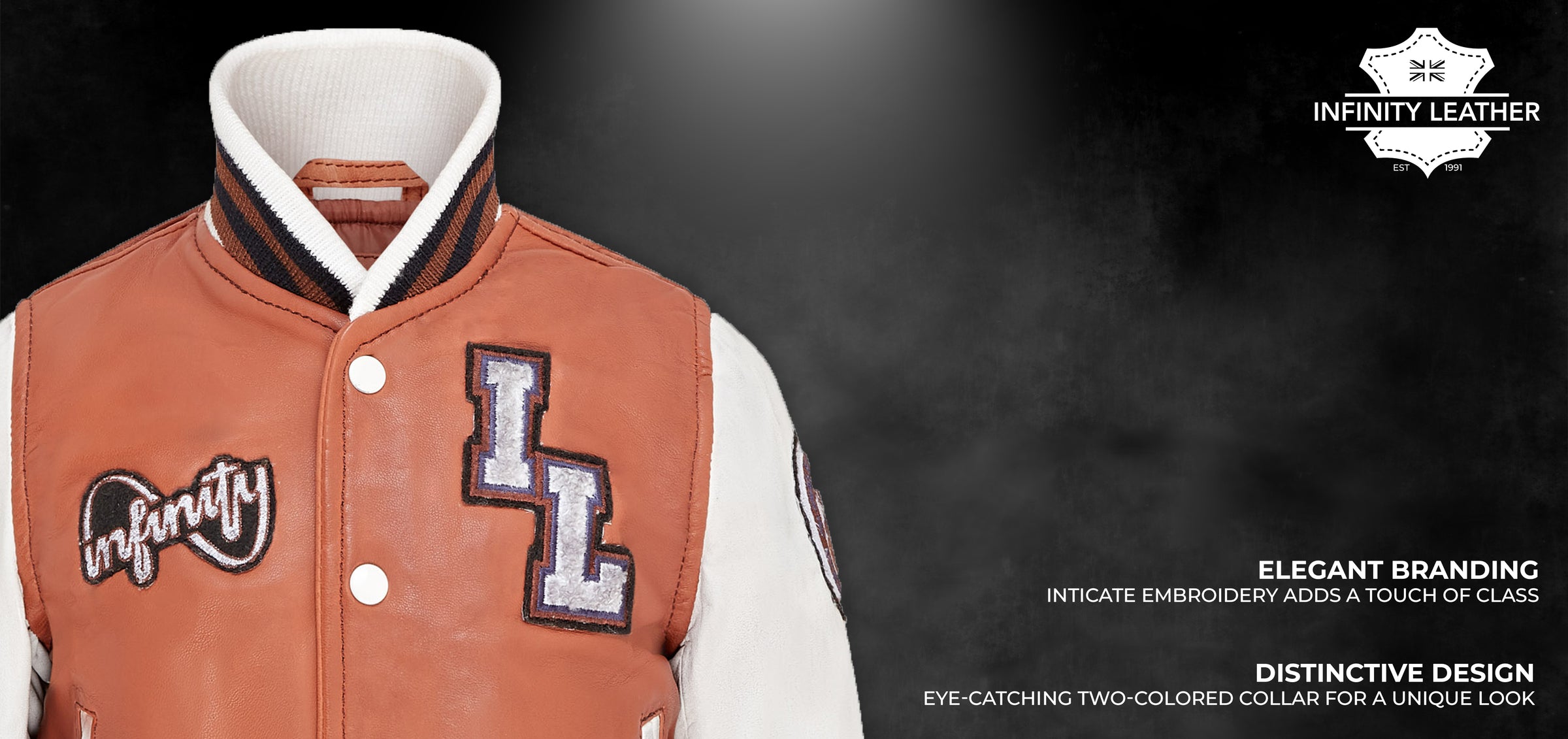 Introducing the Unisex Kids Baseball Leather Jacket, a perfect blend of classic varsity style and modern craftsmanship. This letterman bomber jacket features contrasting sleeves and a striped knit ribbed collar, waistband, and cuffs for a timeless athletic look. The press studs front closure and embroidered brand logo patches on the chest and sleeves add a touch of authenticity and flair. Designed with practicality in mind, it includes two jet pockets at the waist and two inside welt pockets for your essentials. The panelling to the back of the jacket ensures a tailored fit and superior comfort..