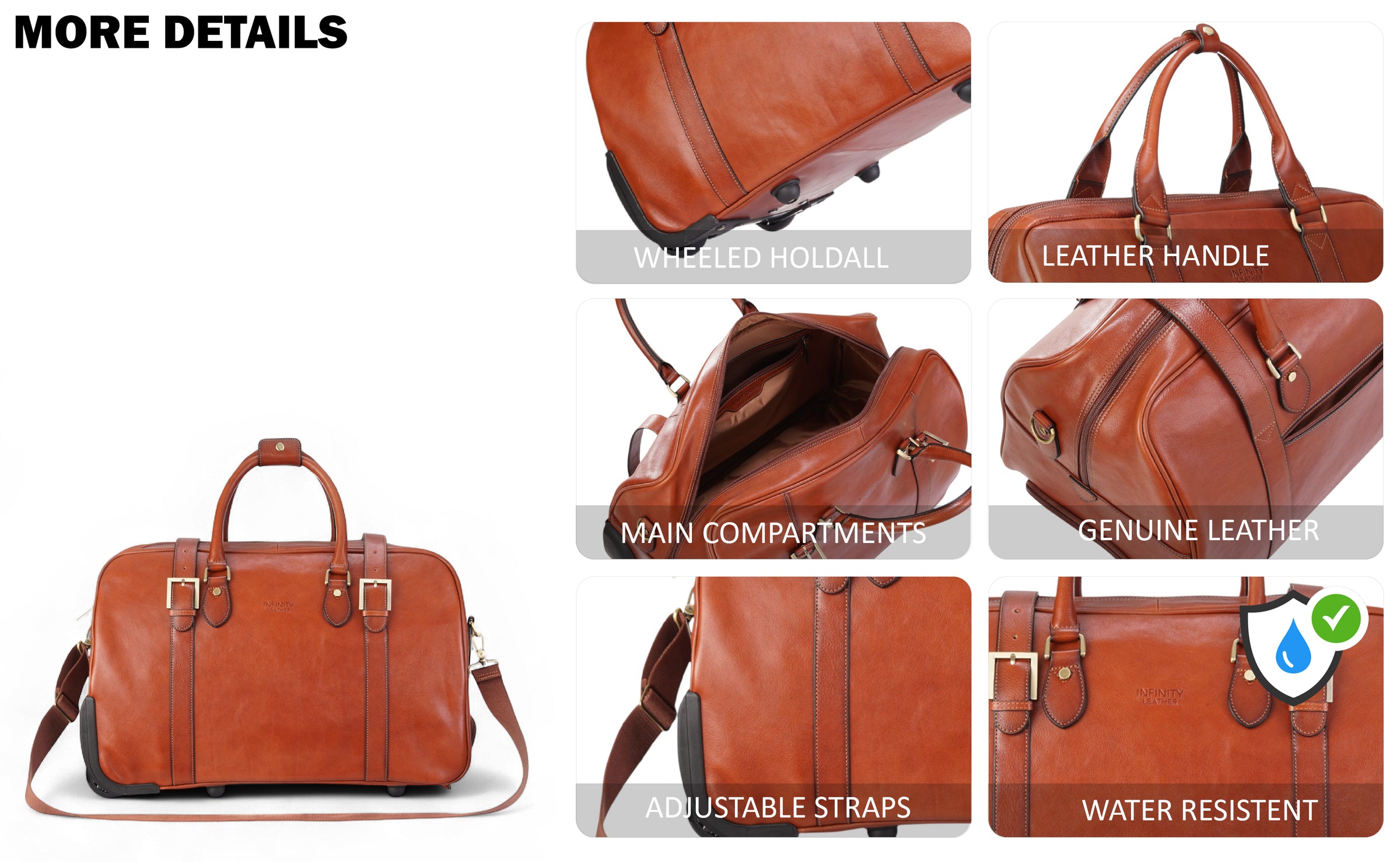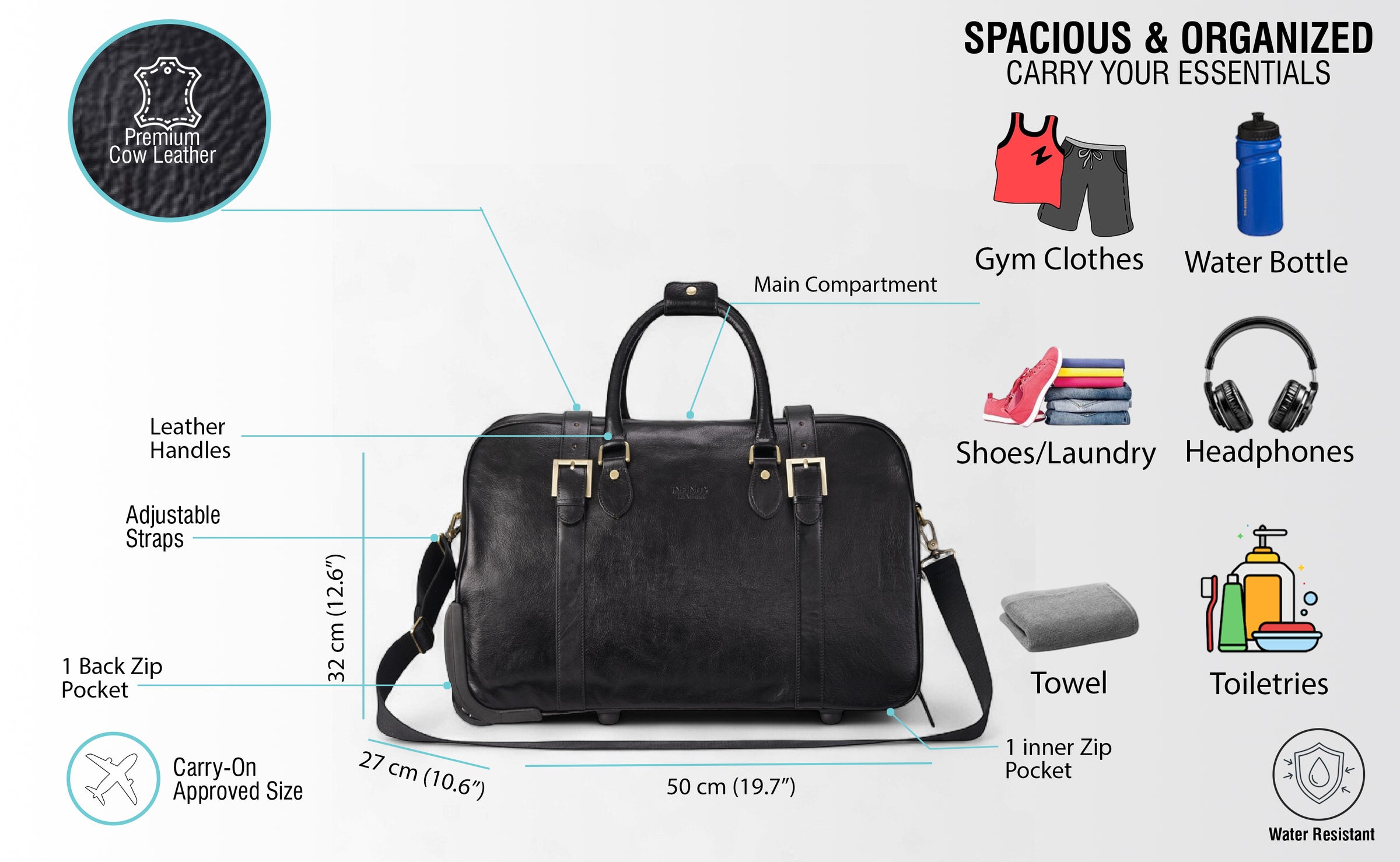 Make every trip effortless with this Genuine Leather Wheeled Holdall Duffle Bag. Perfect for weekend getaways, overnight trips, or cabin travel, it’s crafted from 100% cow leather with antique brass hardware, combining durability, elegance, and vintage charm. Smooth-rolling wheels, adjustable shoulder straps, and multiple compartments keep your belongings organized and accessible, while the spacious cabin-size design fits laptops of any size.