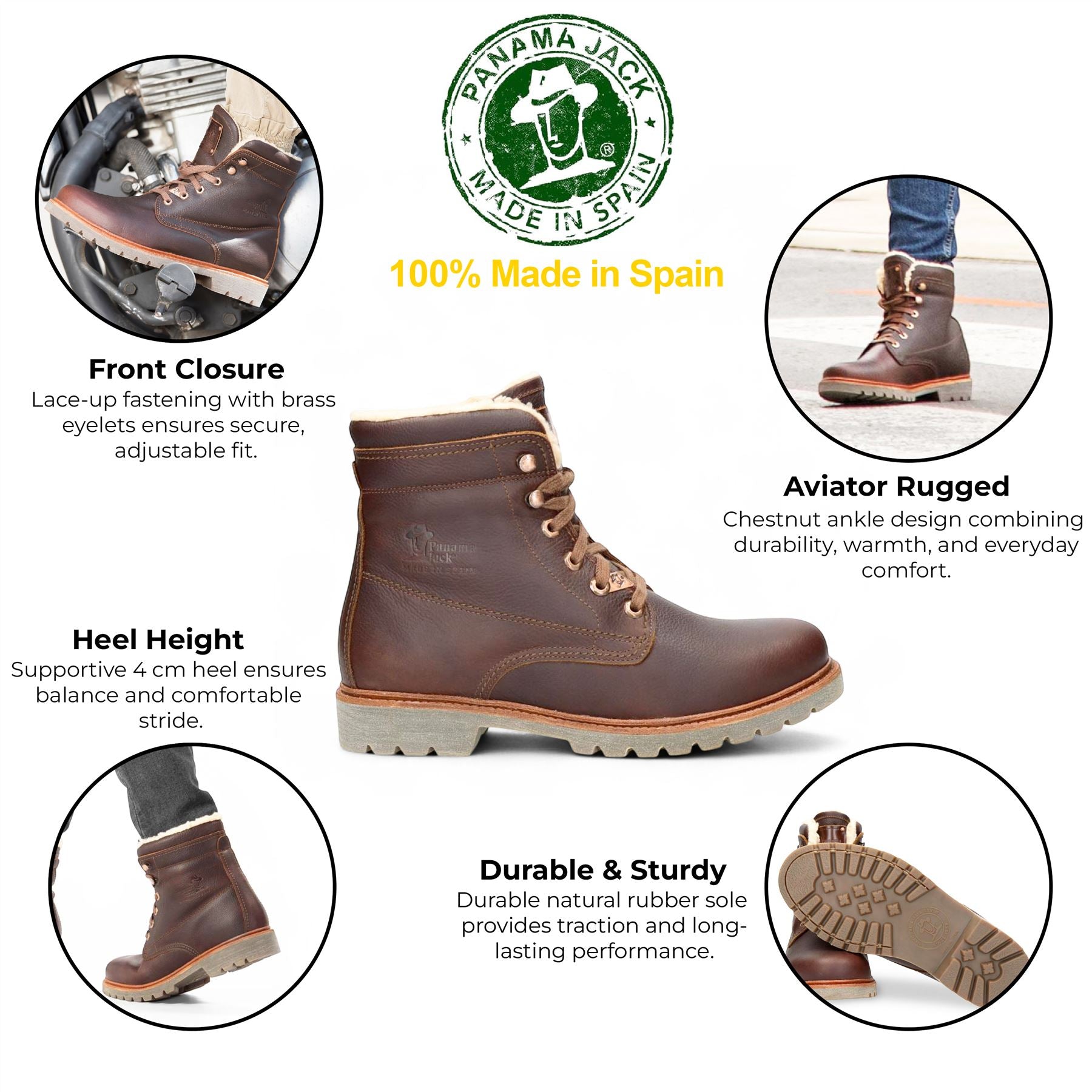 The Panama Jack P03 Aviator C23 boots blend rugged durability with everyday comfort. Crafted from waterproof chestnut nappa leather, these winter ankle boots feature a soft cotton lining, cushioned insole, and a natural rubber sole, offering reliable warmth, grip, and long-lasting wear.