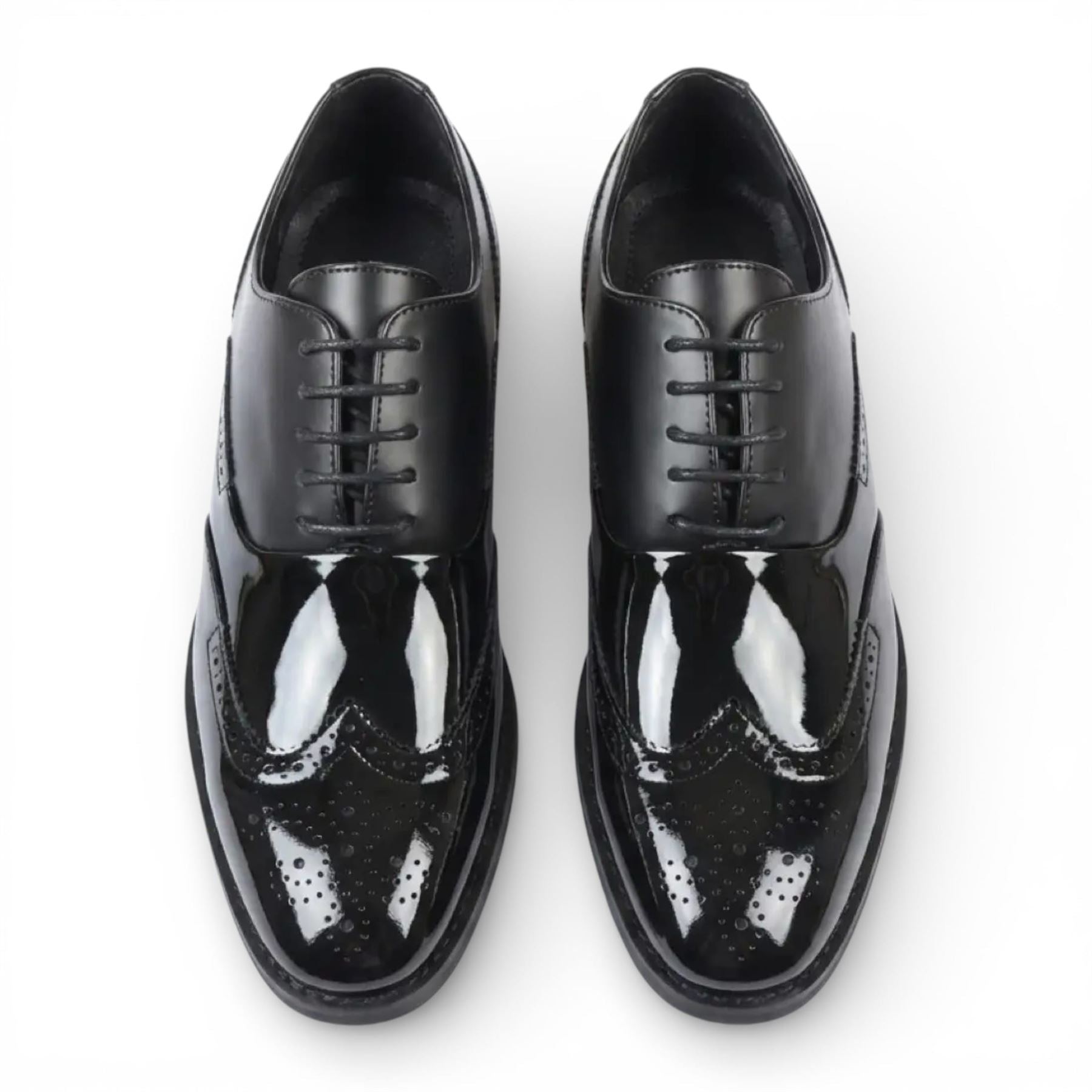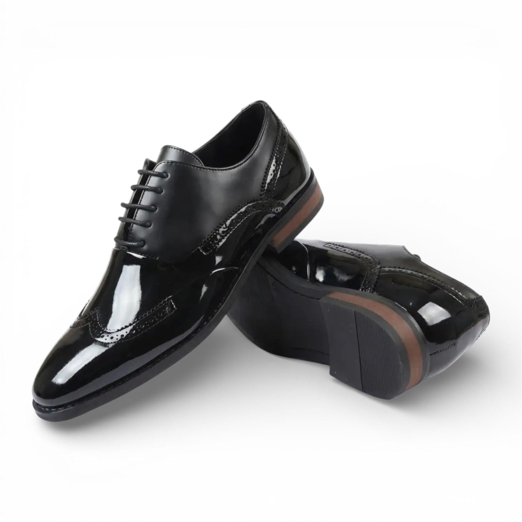 Step into refined elegance with these men’s patent PU leather wingtip Oxford shoes crafted for standout formal style. The high-gloss finish creates a striking shine, while classic wingtip brogue detailing adds timeless sophistication. A layered wood-look heel enhances the silhouette with subtle contrast. Designed with breathable leather lining and cushioned support, these Oxfords deliver confident comfort for weddings, proms, and professional events.