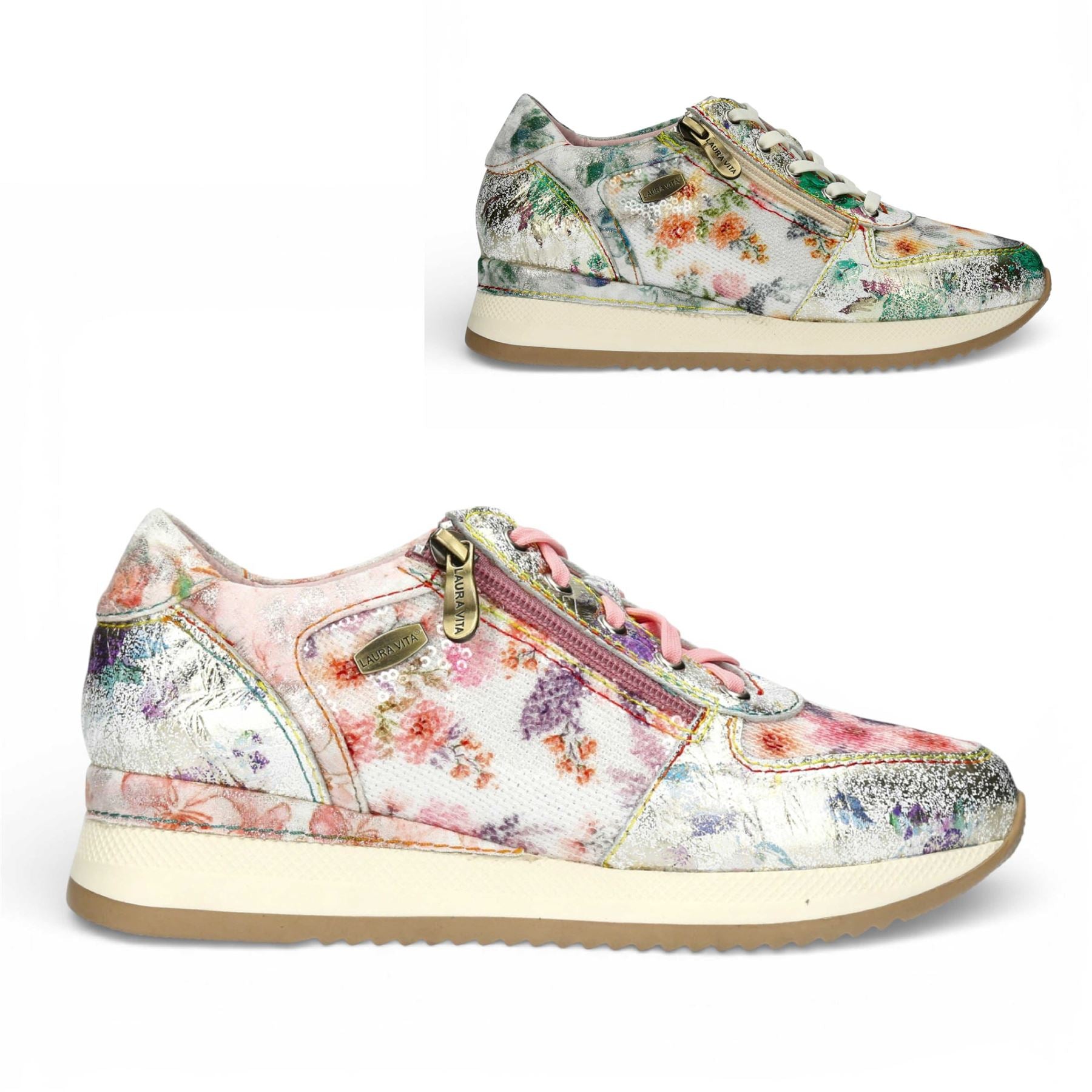 Laura Vita Gycmo 58 sneakers blend artistic flair with everyday comfort. Featuring a vibrant floral leather and textile upper, they deliver a unique handcrafted look. Soft leather lining and insole ensure comfort, while the wedge sole and zip-lace fastening offer stability, ease, and modern style.