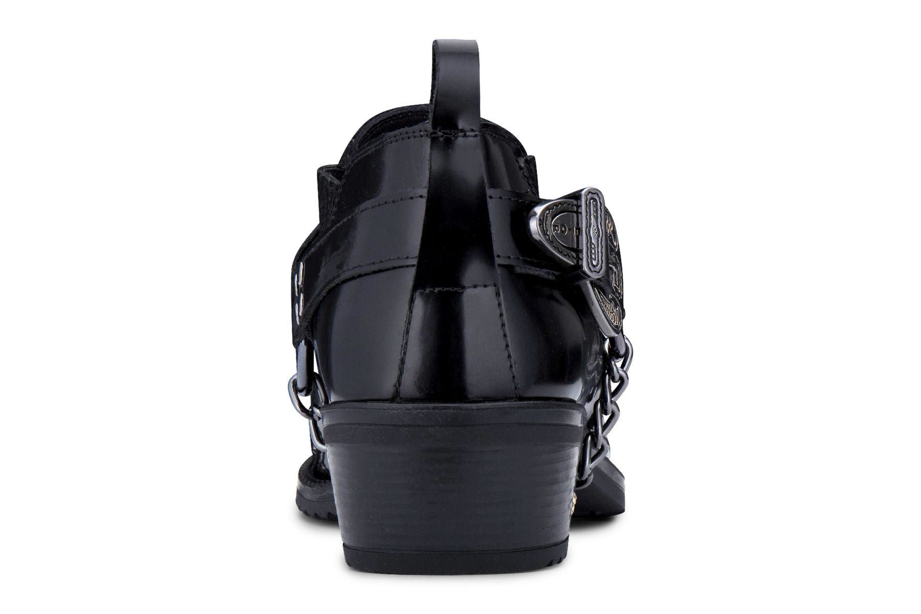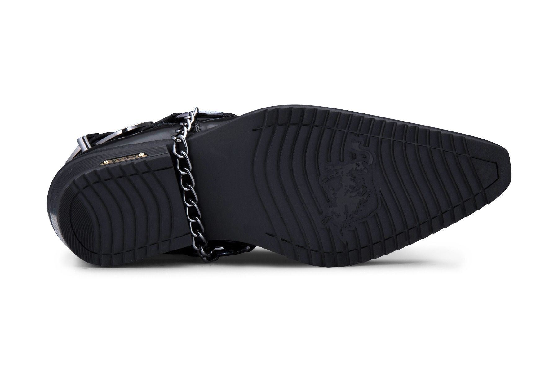 Adjustable Tri-Harness Strap: An adjustable tri-harness strap with a metal chain and studded accents creates a bold and metallic contrast against the smooth leather uppers, making a striking visual statement.
